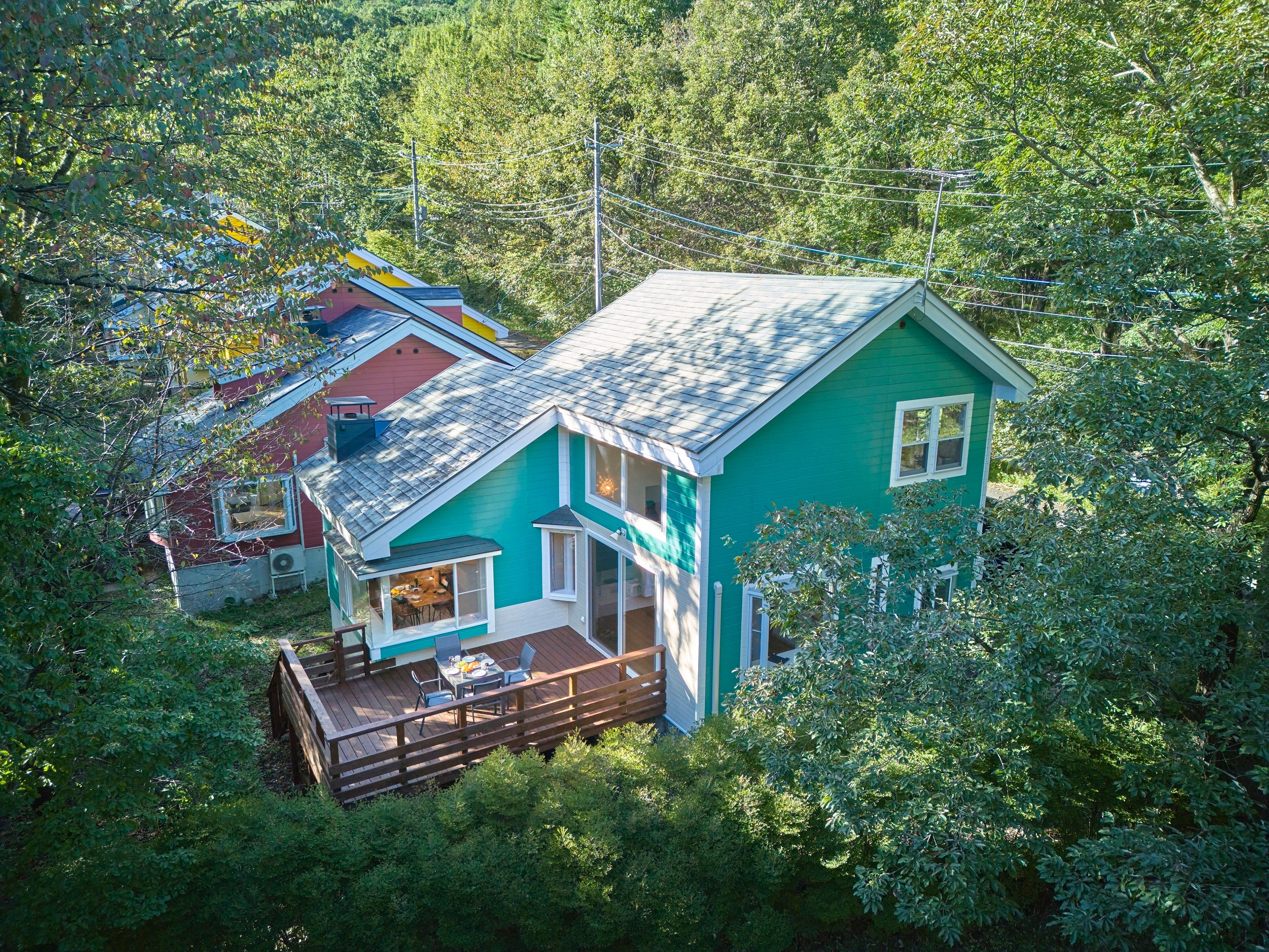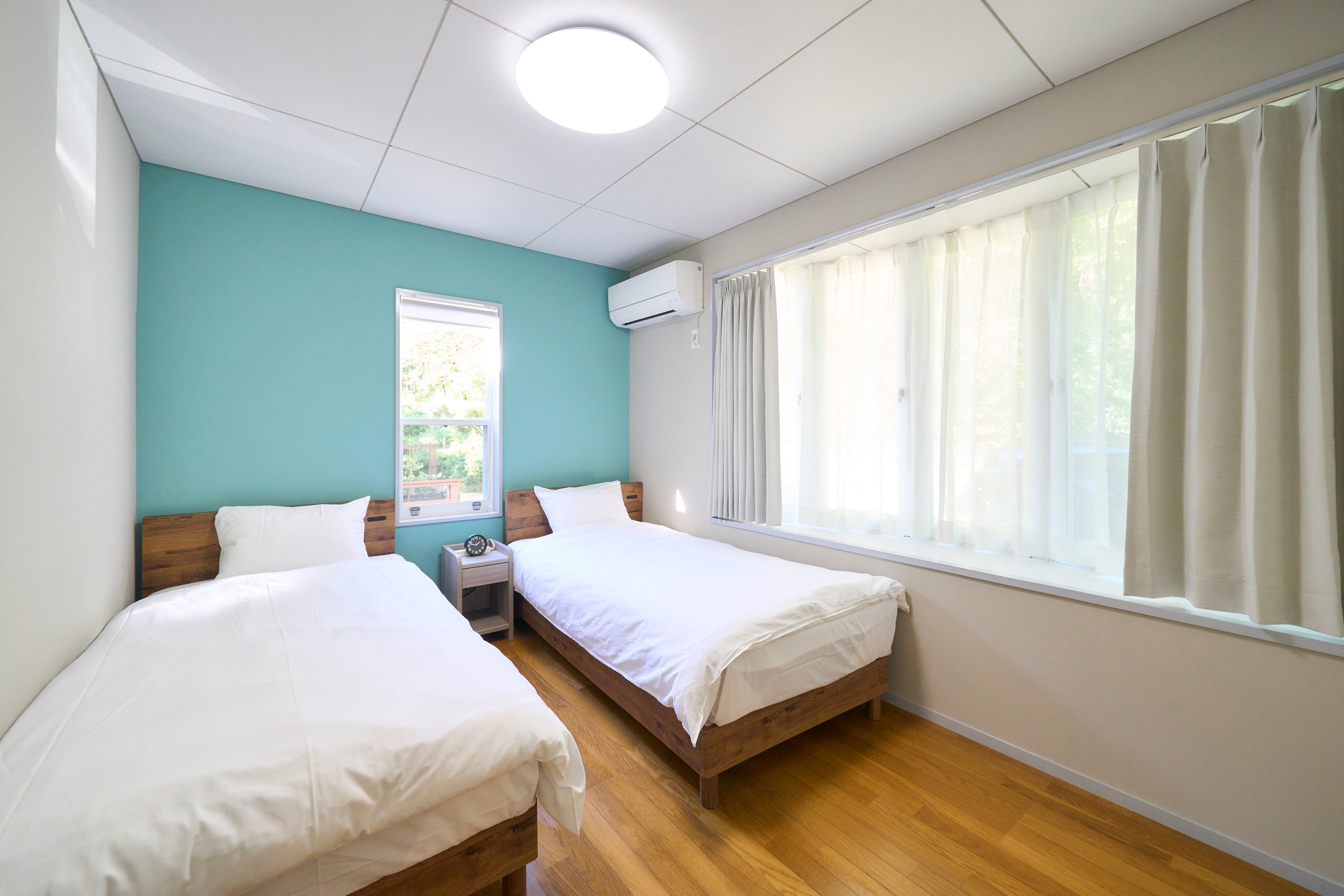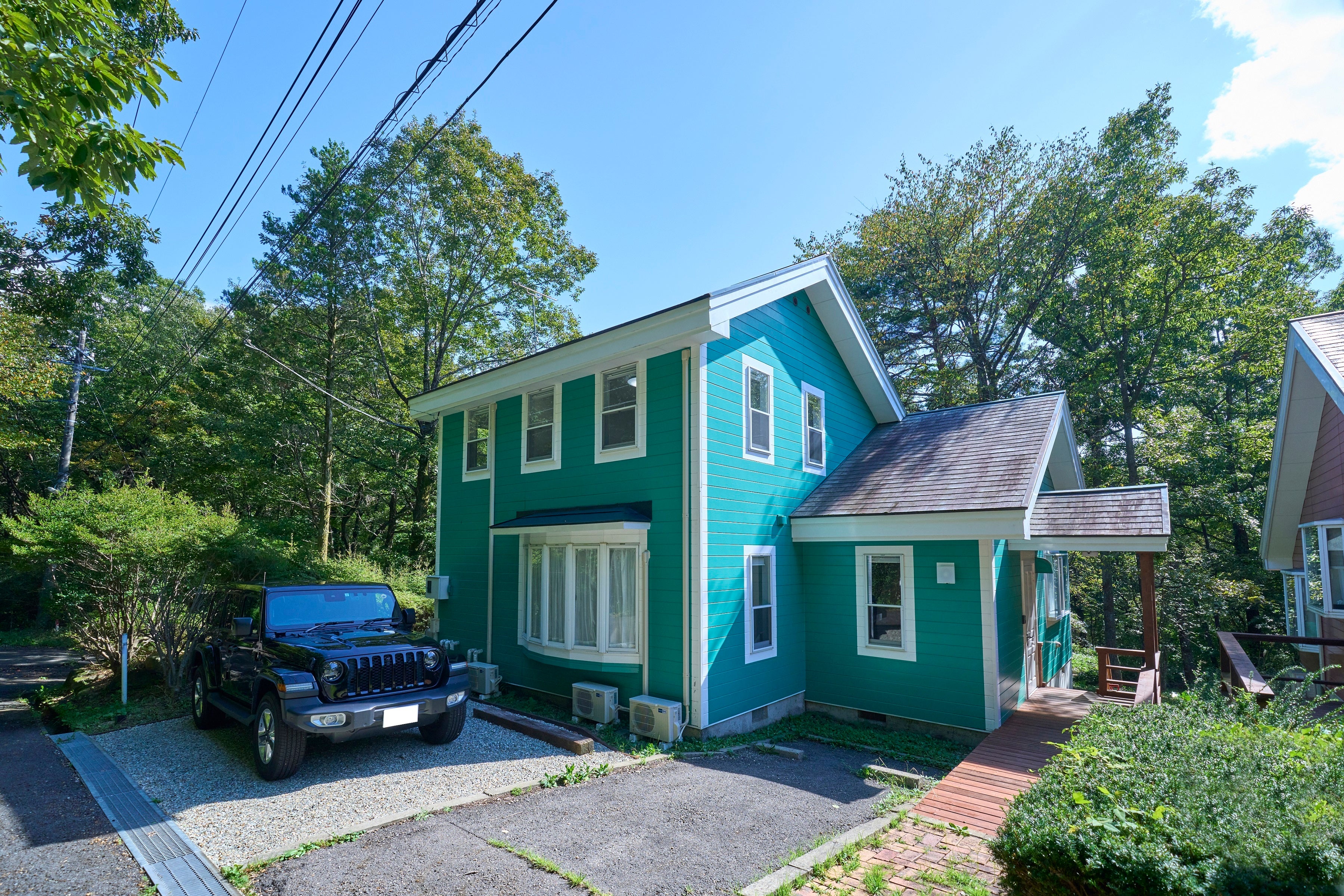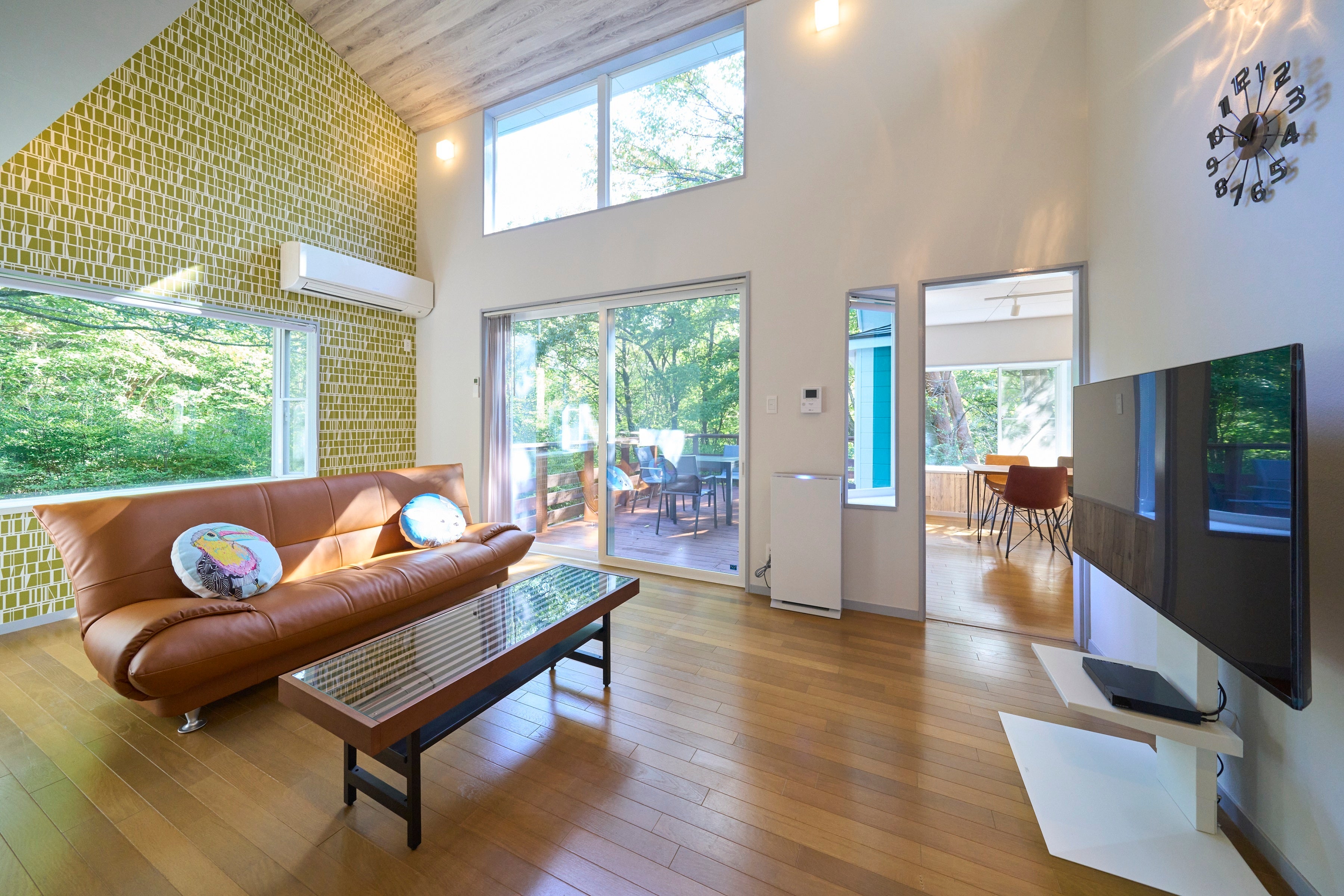 当施設は鮮やかなグリーンが特徴的な外観で、オープンにあたりウッドデッキ、駐車場を拡充、内装をリニューアルし、家具・家電も新調されています。ダイニングには大きな出窓が設置されており日差しが燦燦とさしこみます。リビングは、吹き抜けの高い天井と大きな窓が開放感を演出し、家族そろっての団欒のひとときが過ごせます。さらに、リビングとデッキテラスが繋がっており、周囲に広がる落ち着いた自然の中で森林浴やアウトドア感覚でのお食事を愛犬と共に楽しむこともできます。また、寝室は3部屋(シングルベッド×2・シングルベッド×2・布団×4)で、最大で8名様までご利用いただけます。