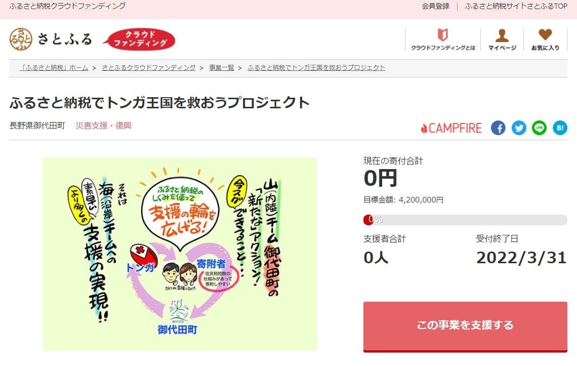 長野県御代田町とさとふる、トンガ王国を支援するため寄付受け付けを開始