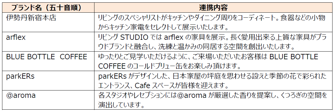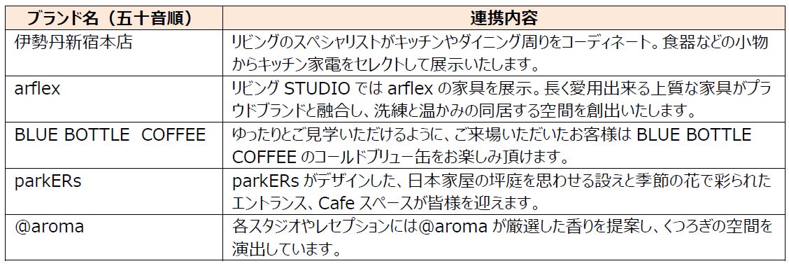 それぞれのエリアでの各ブランドとの連携は以下の通りで、来場したお客様が、住まいだけでなく、その後の暮らしまでイメージできるような空間となっています。