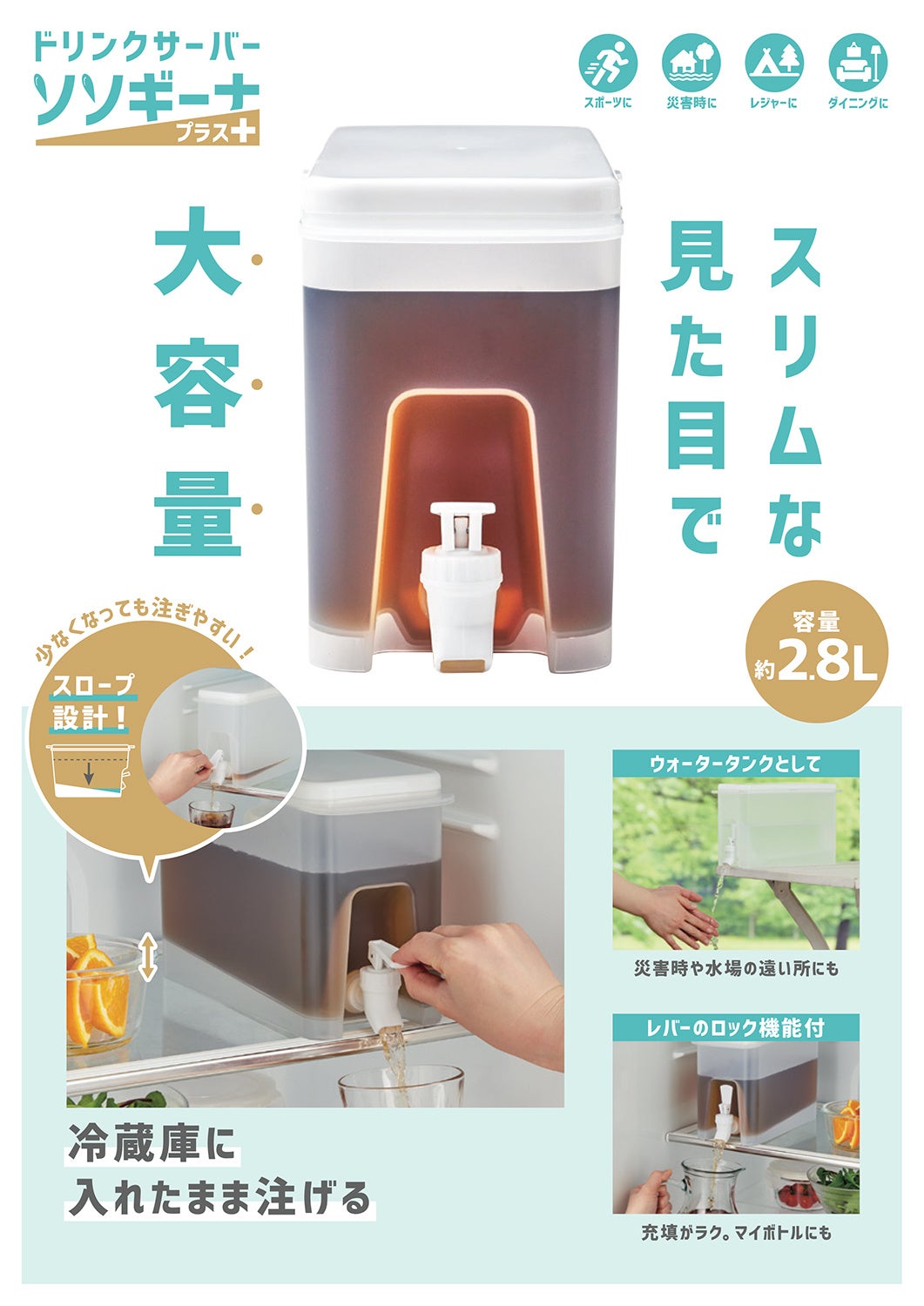 レジャーやダイニング、スポーツ、災害時など様々なシチュエーションで使えて便利!子供から大人まで簡単に入れられるドリンクサーバー。普段使いで備えましょう!
