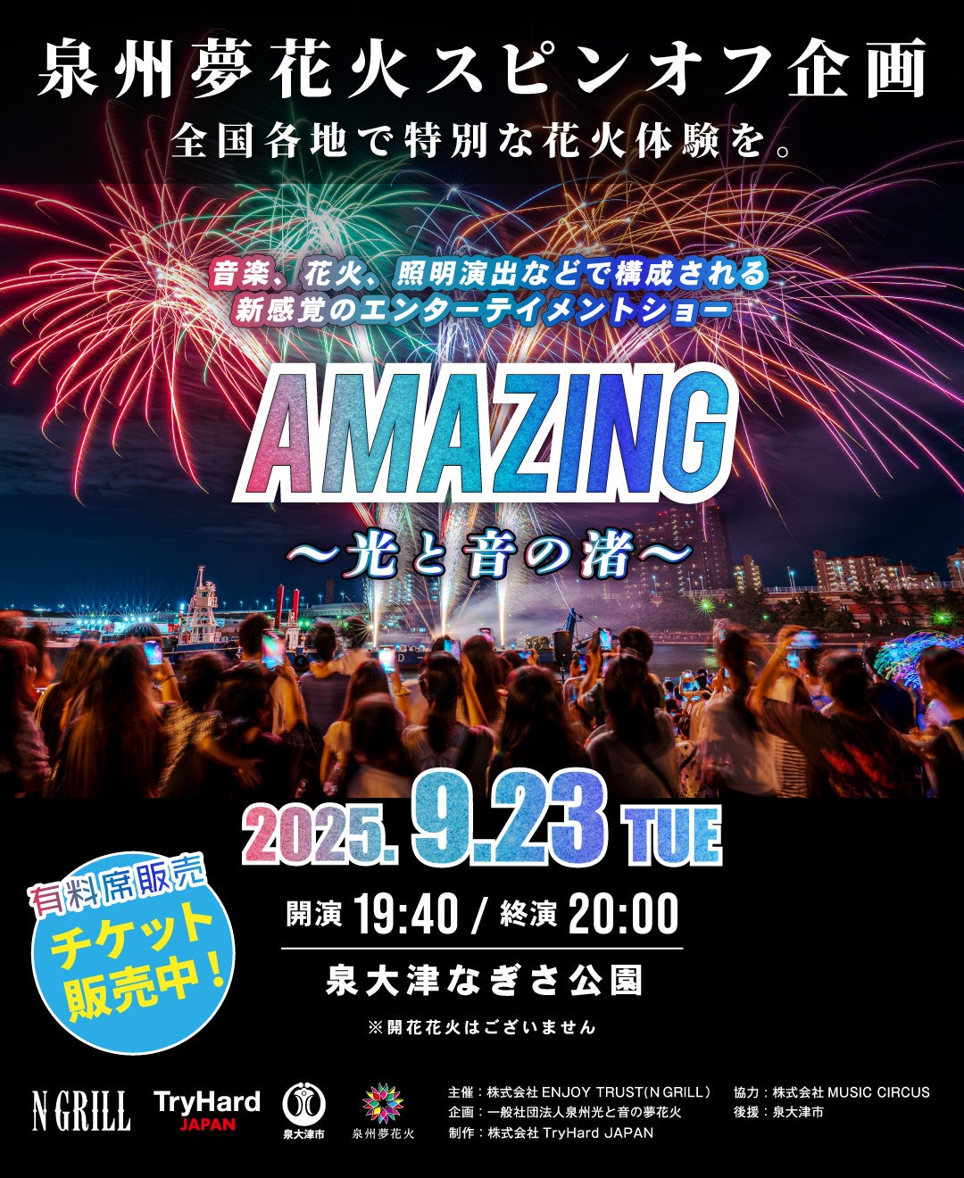 【大阪・泉大津】音楽、花火、照明演出で魅せる新感覚の海辺エンタメショー「AMAZING-光と音の渚-」2025年9月23日(火・祝)泉大津・なぎさ公園にて開催!