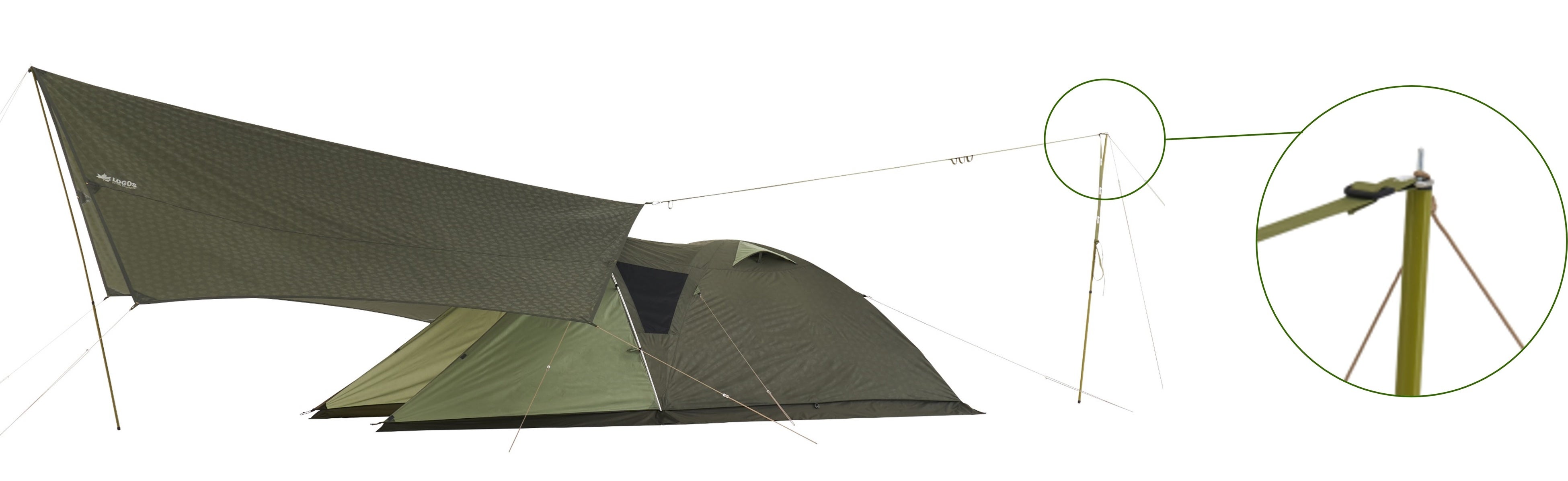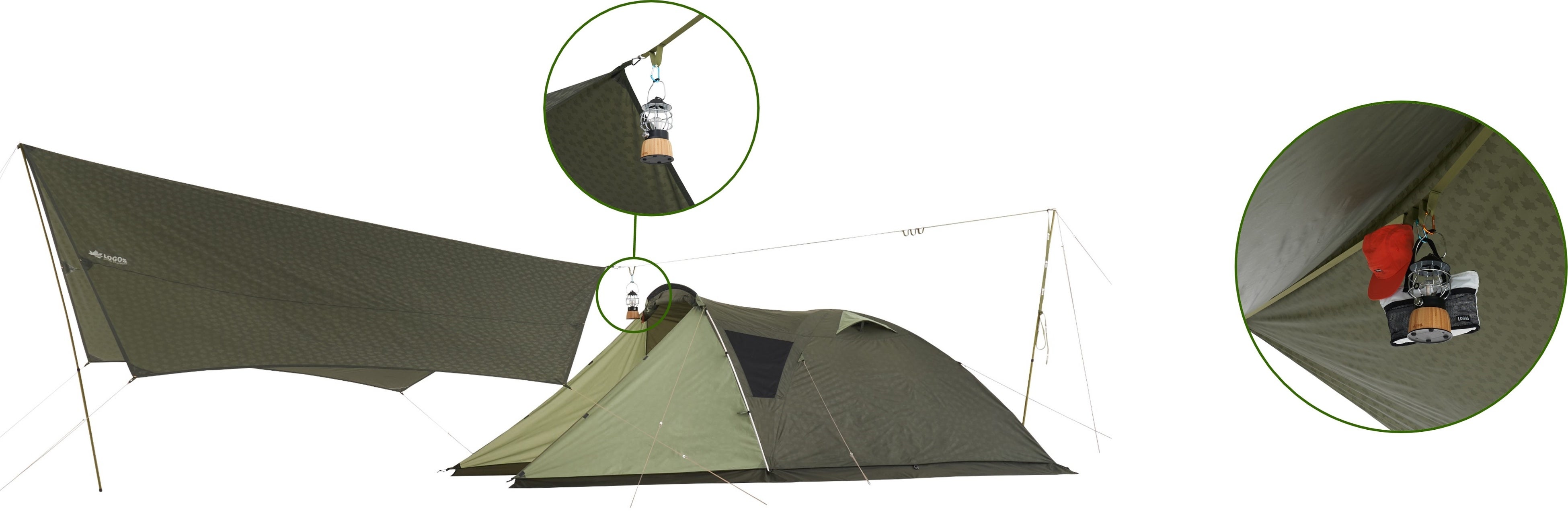 本アイテムは、テントとタープを最適な位置で連結できる便利なベルトです。本アイテムをタープに接続すると、テントをまたいで後方にあるポールと連結することができるため、テントの出入口にポールを設置せずにすみ、スムーズな出入りを実現します。また、ベルトの端にあるループを使用すると、テントの出入口付近にランタンを吊るすことができ、靴を脱ぎ履きする際に足元を照らせるほか、ベルトの中央部分3カ所にあるループを使用すれば、ベルトをタープの内側に設置した時にはタープの内側にランタンや帽子などの小物を吊るすことができます。
