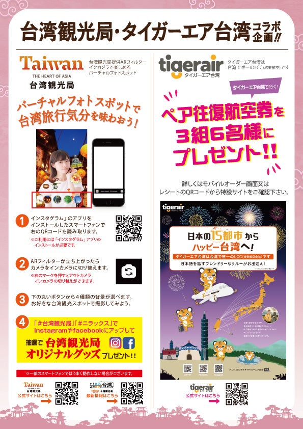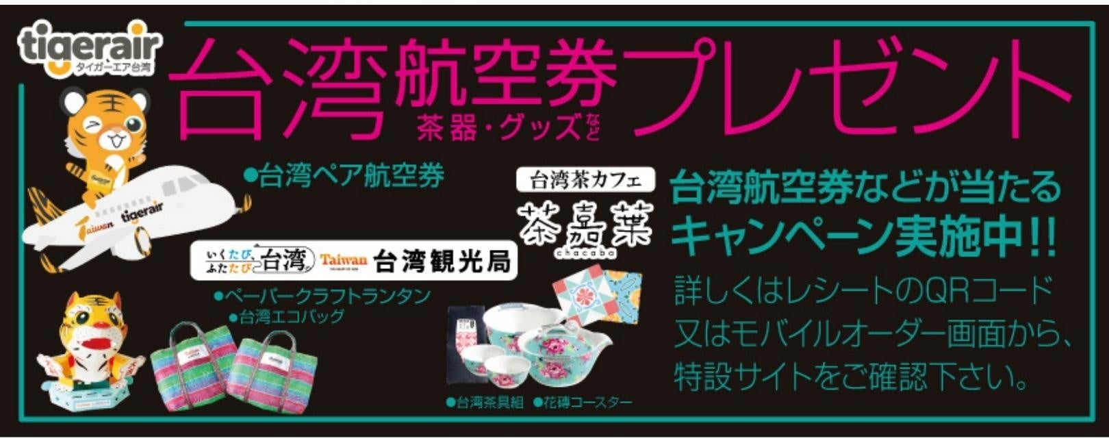 ・対象店舗をご利用頂いたお客様限定にて、台湾往復ペア航空券や厳選した台湾雑貨が当たるプレゼント企画です。