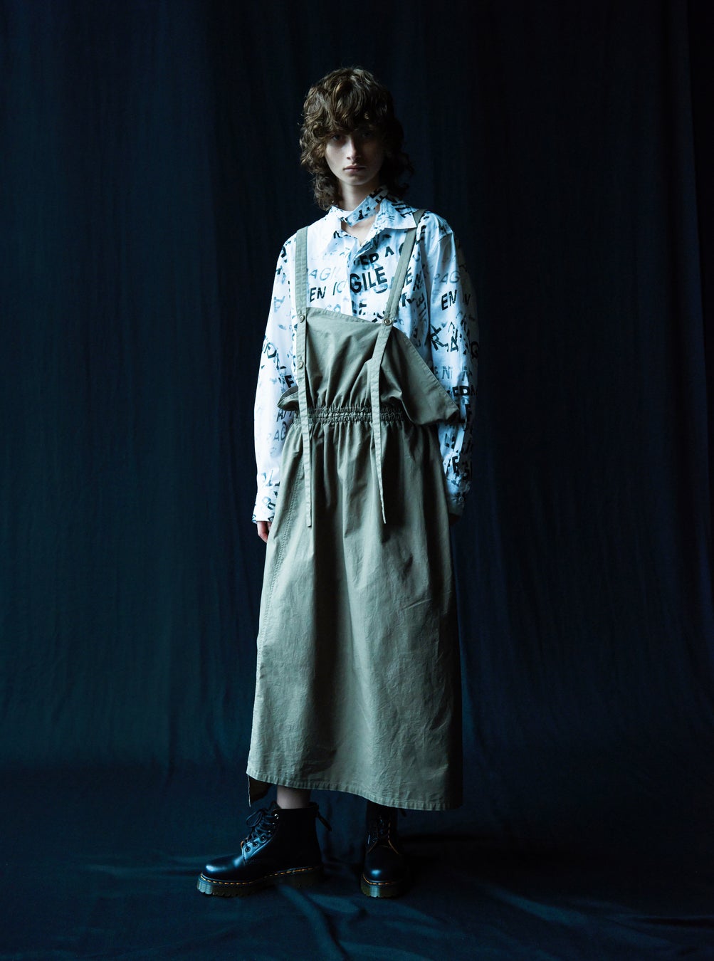 長方形の構成で作られたサロペットドレスと、強さのあるシャツ。上襟にストリングタイが付いた2重襟のシャツはフロントも重ねたようになった華やかなディテールで、サロペットドレスのギャザーとシャツの襟元やフロントの陰影、プリント柄が交差し、崩したまとまりあるスタイルに。