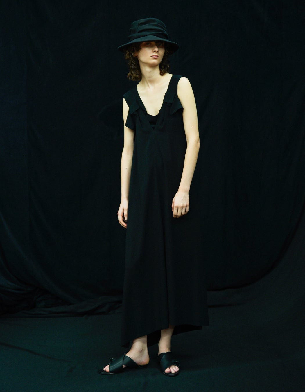 シンプルなIラインに胸元に施されたタックや脇に流れるドレープで布の動きが加わったサマードレス。右脇に布を重ねる様に縫い合わせることで深いスリットがつくられ、歩くと見える肌が夏を感じさせる。