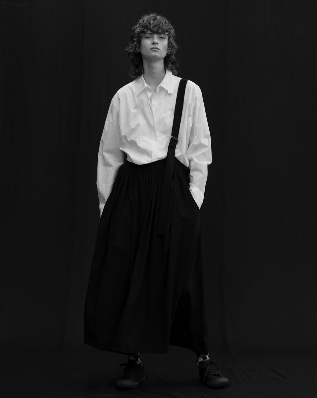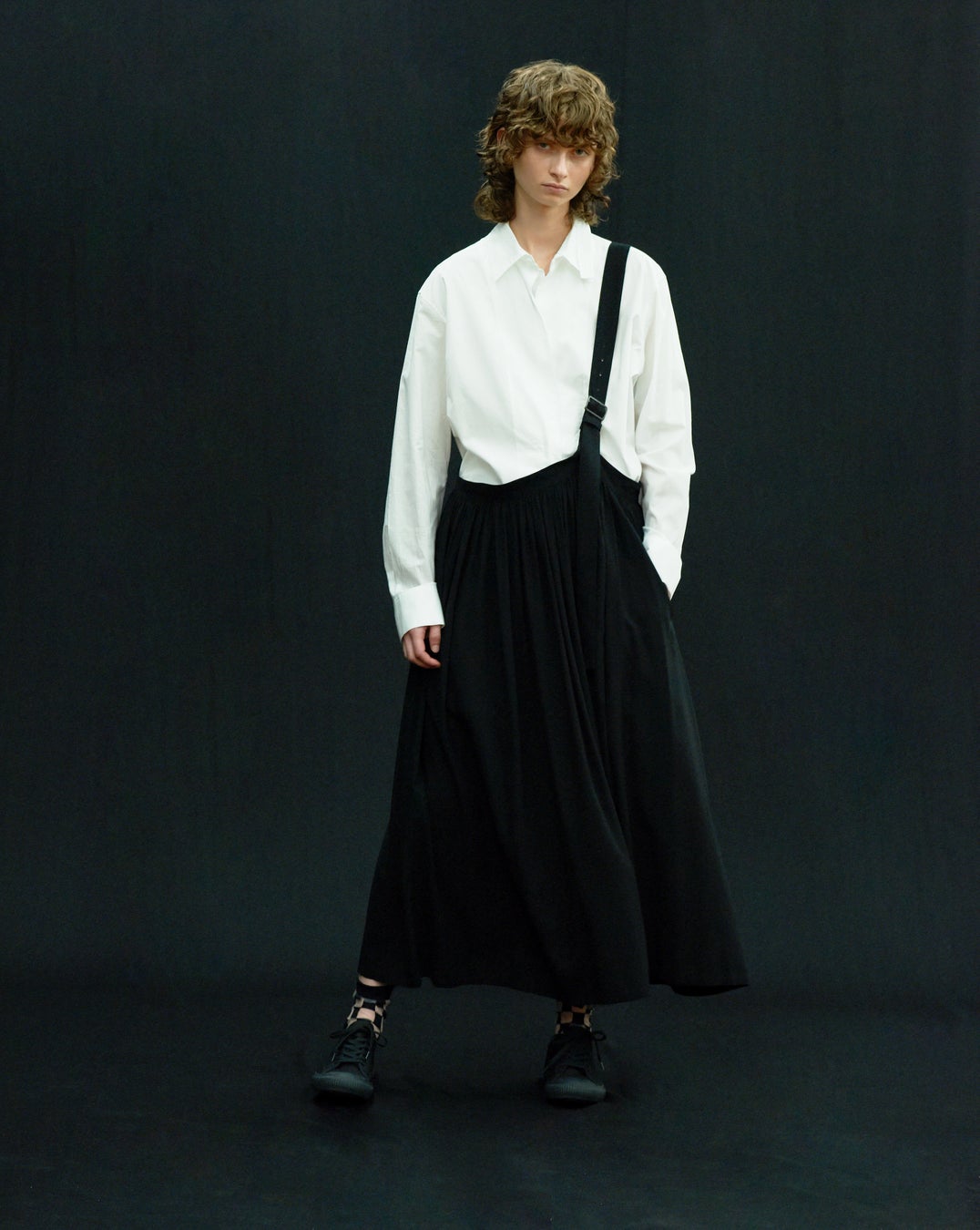 ワンショルダーのサスペンダーで、アシンメトリーシルエットになるスカート。細かなギャザーが入り、たっぷりと使われた布地が歩くと揺れ動き、春夏らしい軽快な装いに。白いシャツを合わせ、Y'sらしいスタイル。
