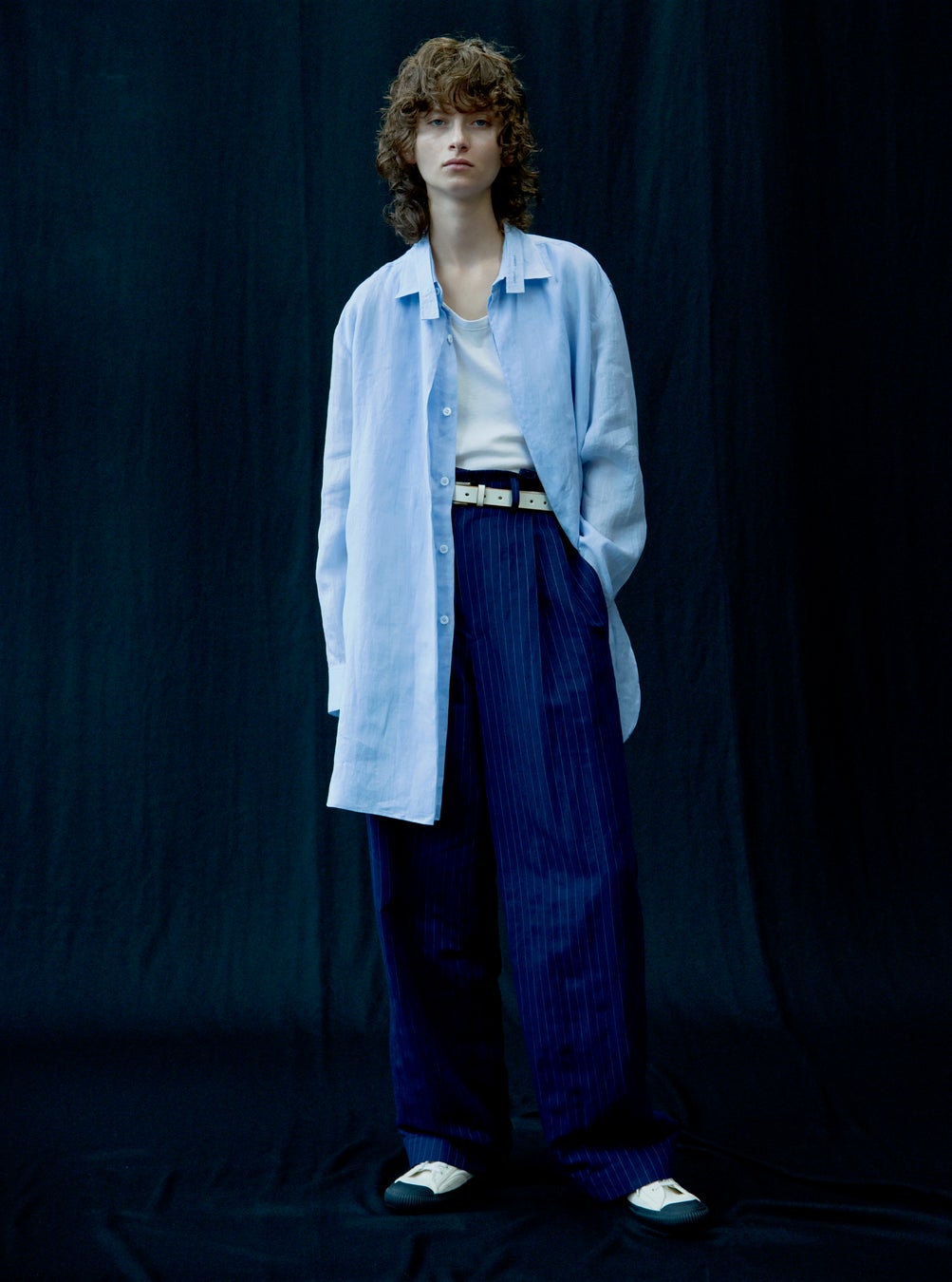 細いラミーでつくられた生地で仕立てられた、上襟にストリングタイが付いた2重襟のシャツ。緩やかに丸みを帯びたワイドシルエットがメンズライクなパンツは、タックの折り返しを、つまんで履いたようなディテールにすることで、女性らしい表情が加わる。