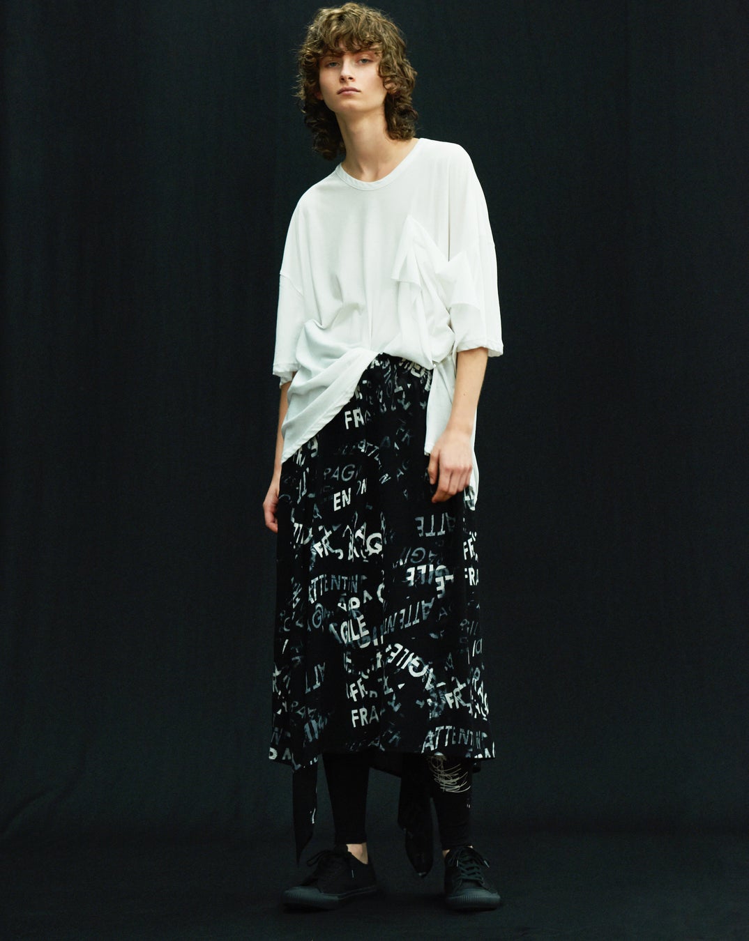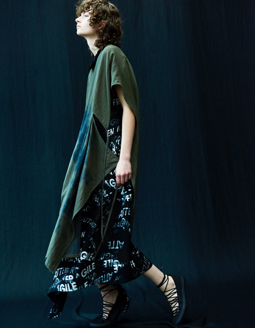ATTENTION FRAGILE──「取扱注意」と書かれたテープで巻かれたようにプリントされた服。非対称に揺れる服は、どこか儚く危うさを持つことを伝えているようで、それを覆う表面のグラフィカルな表現が現代を生きるタフな精神を明るく示しているようです。
