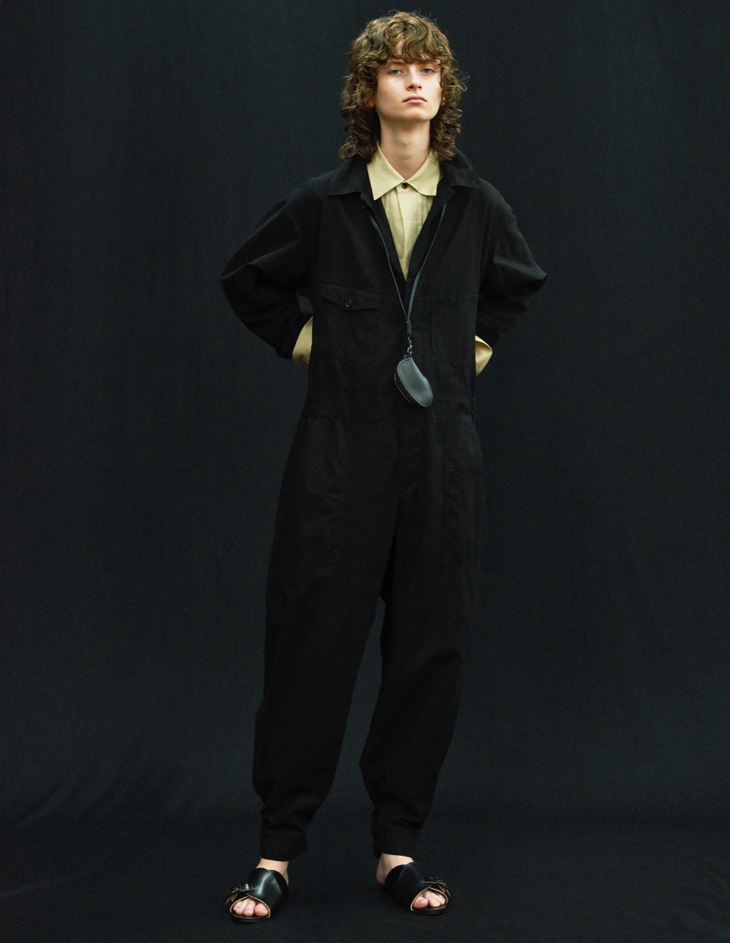 ワークウェアのつなぎに、19世紀のシャツを着想源としたプリーツ布付きのシャツを合わせる。ブラックとベージュのレイヤード。作業着本来の動きやすさを保ちながら女性の身体に緩やかに沿って落ちるフォルムのジャンプスーツ。胸元に覗くシャツのランダムなピンタックがワークウェアに華やかさを添えデイタイムのスタイルに変える。