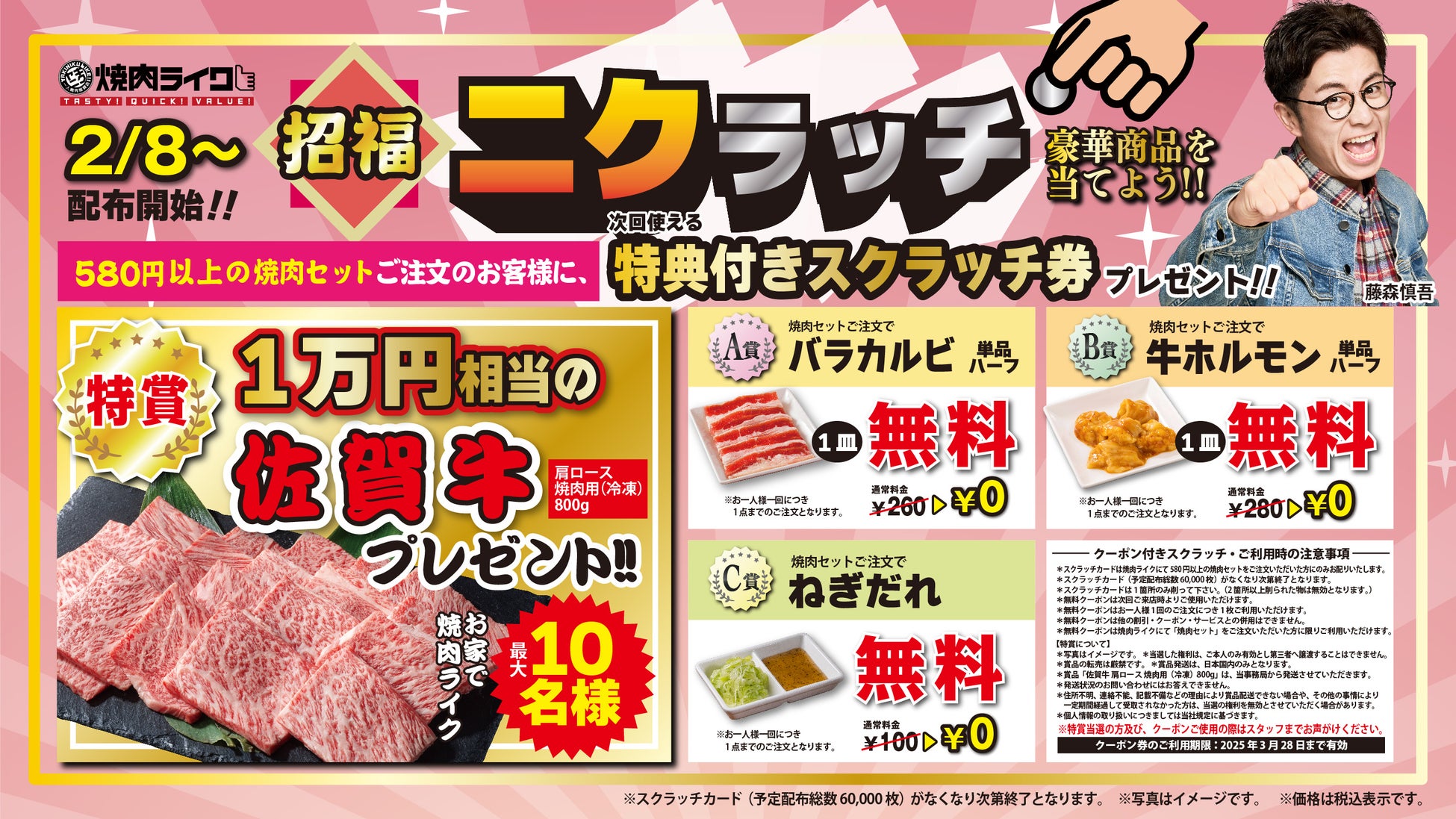 2025年2月8日より焼肉セットをご注文いただいたお客様全員に、ハズレなしの特典付きニクラッチ券を配布します。