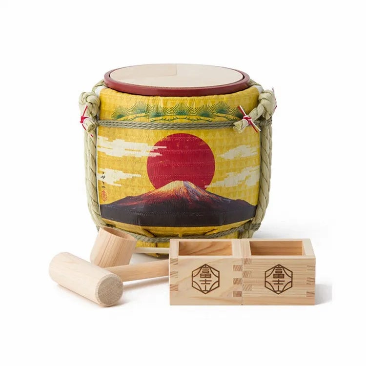 「~土産樽~ 御来光」は日本らしさを意識したデザインで、お土産にぴったりなミニ鏡開きセットです。日本の山といえば、誰の心にも浮かぶのが富士山。富士の頂きから昇る朝日に、潔さと希望を込めて。グラフィックデザイナー 角 和輝(すみ かずき)氏によるデザインです。