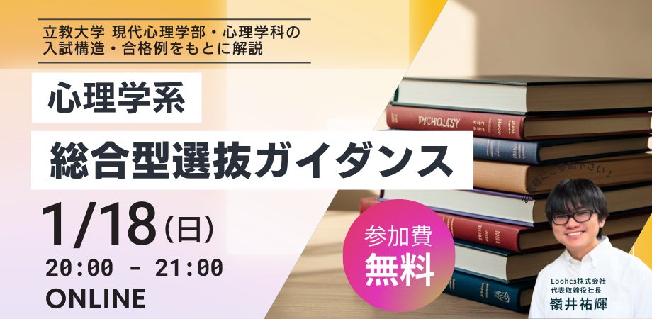 総合型選抜(旧AO入試)・学校推薦型選抜対策専門塾を運営する Loohcs株式会社(本社:東京都渋谷区、代表取締役:嶺井祐輝) は、心理学系学科への進学を検討する高校生・保護者を対象に、「心理学系 総合型選抜ガイダンス」を2026年1月18日(日)20時よりオンラインで開催いたします。