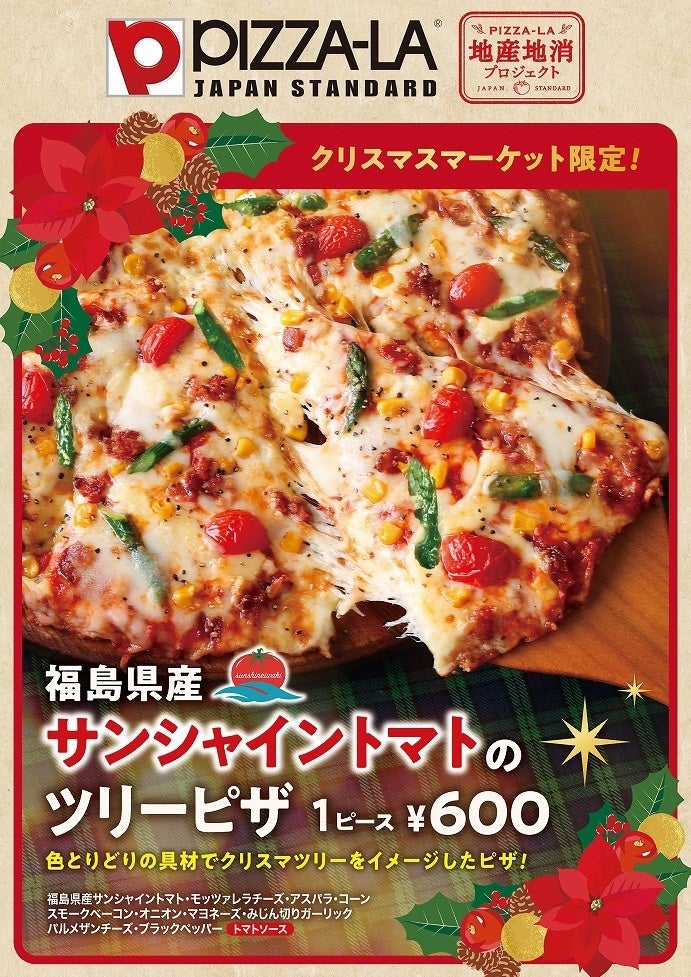 株式会社フォーシーズ(本社:東京都港区南青山 代表取締役会長兼CEO:淺野幸子)が展開する宅配ピザ「PIZZA-LA」は、同社「地産地消プロジェクト」の取り組みとして、福島テレビ主催「ふくしまクリスマスマーケットatまちなか広場」のイベント会場限定で、県産食材を使用した地産地消ピザ『福島県産サンシャイントマトのツリーピザ』の販売を行います。
