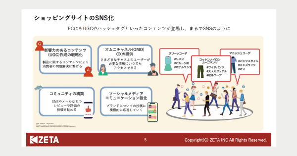 近年SNSの利用が日常化したことで、ECサイトにもUGCやハッシュタグといったユーザー同士の交流を後押しするコンテンツが登場しており、今後ECサイトはショッピングをするだけの場ではなくユーザーをワクワクさせる「コマースメディア」へ進化していくと考えられます。