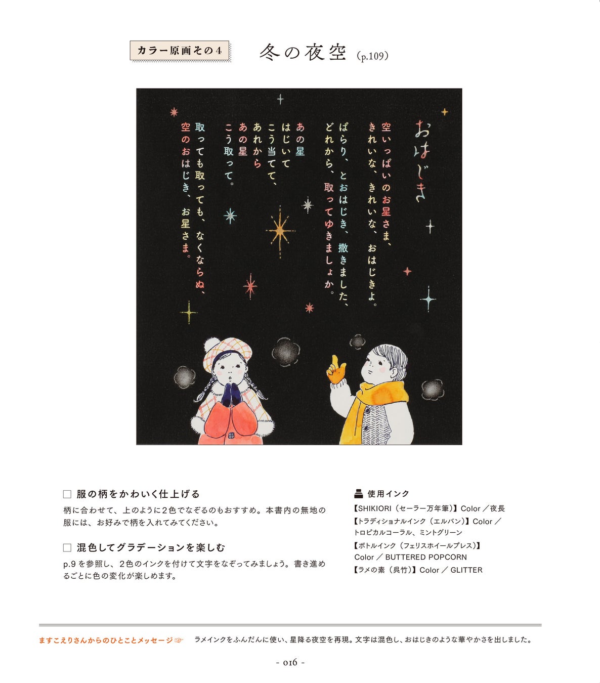ますこえりさんならではの、愛らしくもクスッと笑える女の子や子どもたちとともに季節の移ろいを感じられるイラストばかりです。乙女心くすぐるかわいいパッケージやラメインクも活用できる夜空のデザイン、ついのぞき見したくなる日記など、イラストに合わせてインク×色数を選ぶのもまた一興。自分でイラストを描くのが苦手な方も、丁寧になぞれば、ますこさんのかわいいイラストが仕上がるはず!
