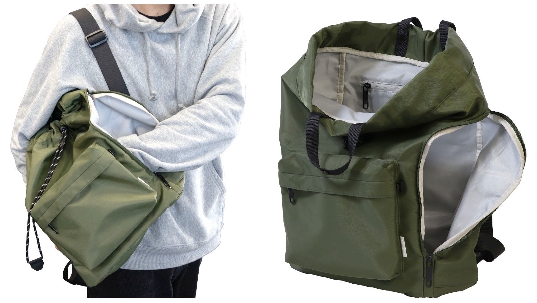 巾着タイプ設計×大きなサイドファスナーで荷物の出し入れの煩わしさを軽減