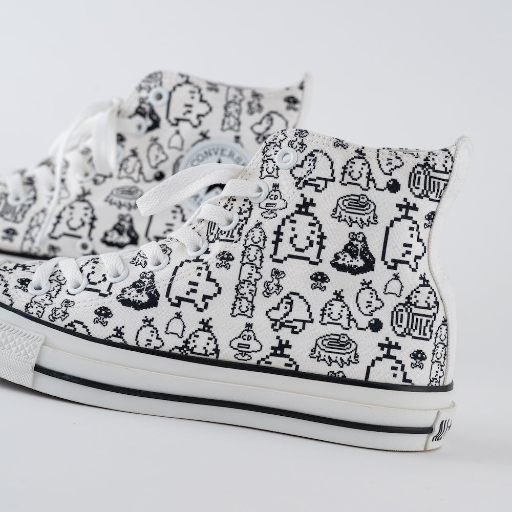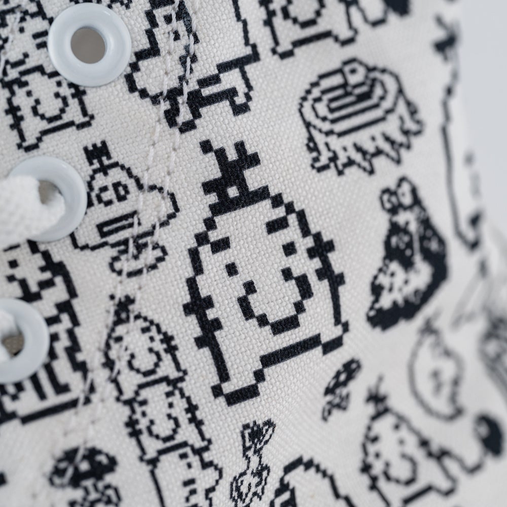 まずご紹介するのはシューズウェアをはじめとするライフスタイルブランド「コンバース」とほぼ日MOTHERプロジェクトがはじめてコラボレーションをしたスニーカー。オールスターのハイカットをベースに、ゲーム『MOTHER』シリーズの人気キャラクター「どせいさん」のドット絵がモノクロの総柄でプリントされています。