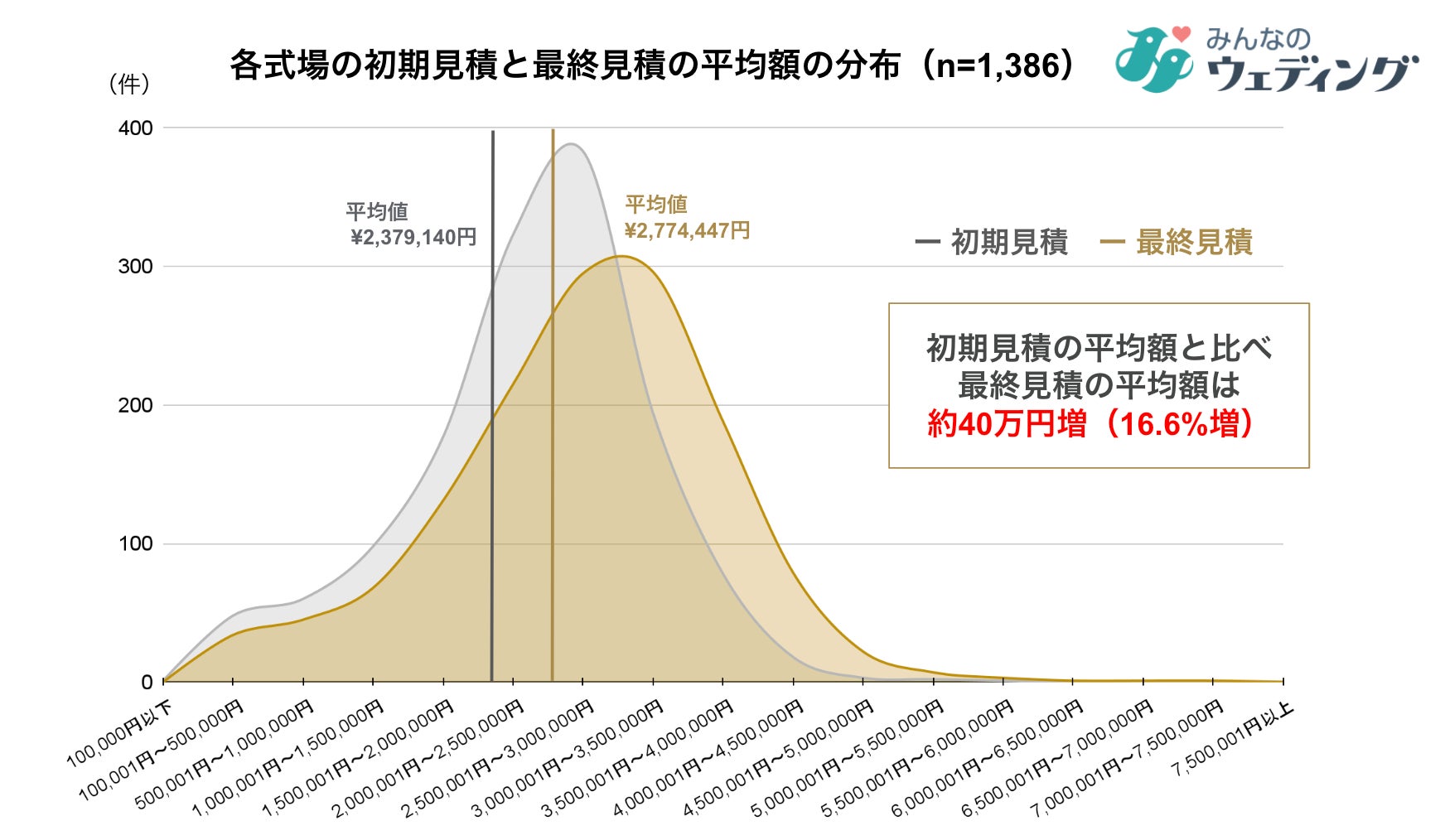 結婚式を挙げる多くのカップルにとって、初期見積から最終見積への費用増加は大きな悩みとなっています。2007年11月1日〜2024年9月30日に「みんなのウェディング」に投稿された各式場の初期見積と最終見積の平均金額を分析した結果※2、式場全体で初期見積の平均は約238万円、最終見積の平均は約277万円となり、約40万円の追加費用が発生していることがわかりました。割合にして16.6%の費用増加になります。