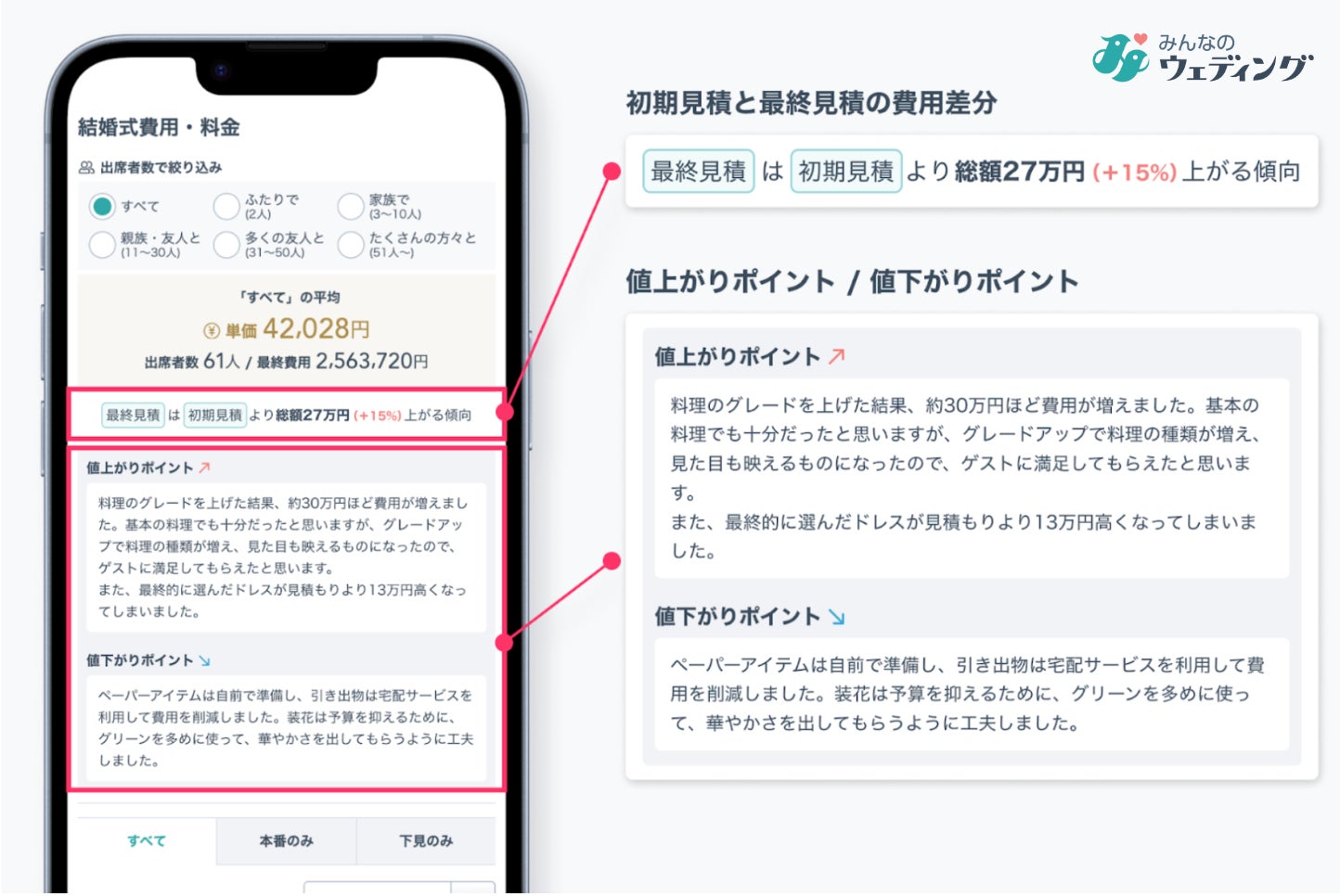「みんなのウェディング」には、実際に結婚式を挙げたユーザーが投稿した10万件を超える費用明細が蓄積されています。それらのリアルな投稿データをもとに、初期見積と最終見積の平均差分を分析し表示する「見積ギャップレポ」機能を追加しました。検討している出席者数で絞り込み、予測費用を調べることができます。さらに、費用が上がりやすいポイントや下がりやすいポイントについて、ユーザーの実体験に基づいたコメントを表示する機能も追加。これにより、カップルは最終的な費用を予測しやすくなり、より精度の高い予算を組み立てることができます。