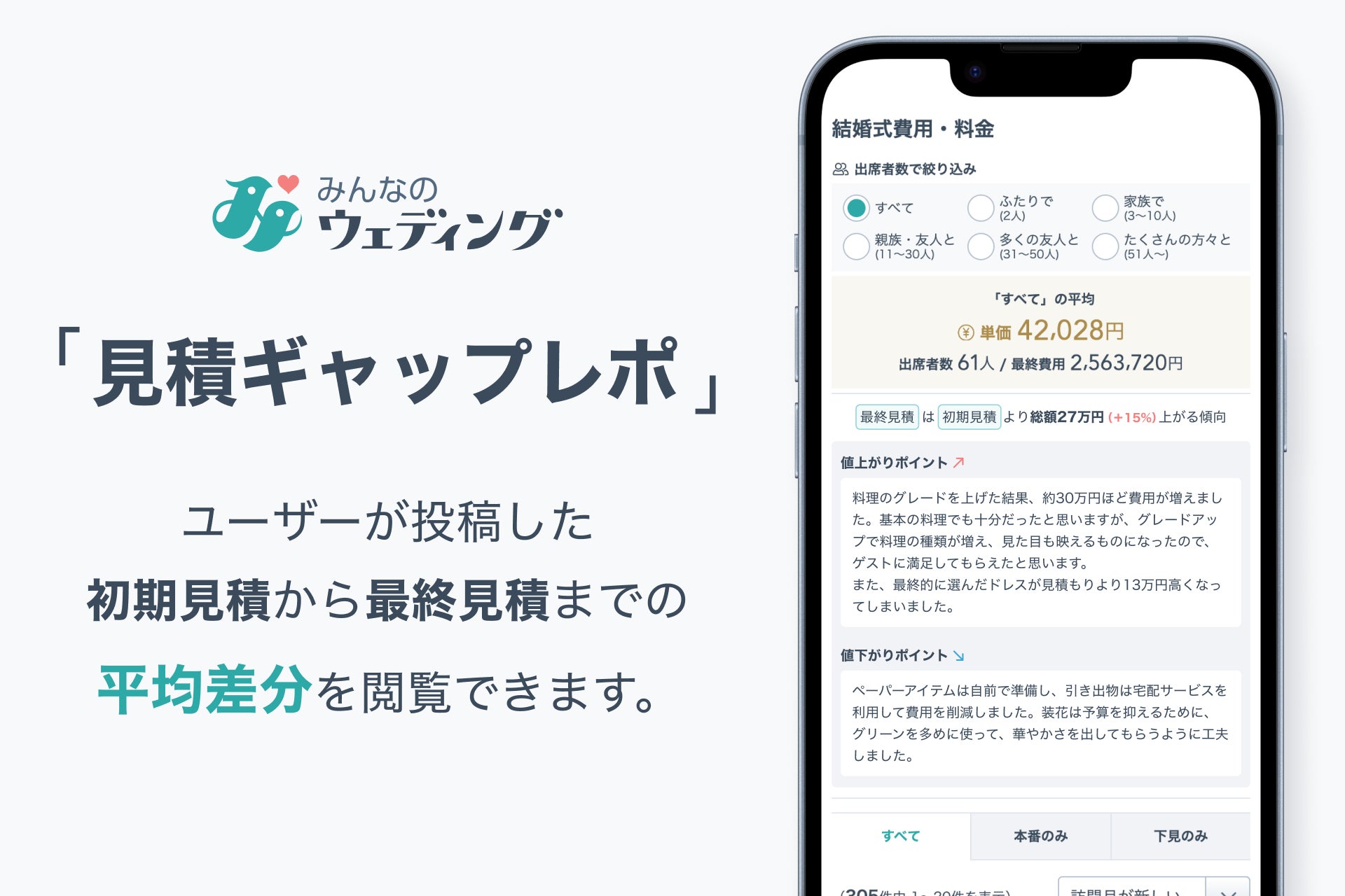 株式会社くふうウェディング(くふうカンパニーグループ)は、ウェディング総合情報サイト「みんなのウェディング」に、初期見積と最終見積の平均差分を閲覧できる「見積ギャップレポ」機能を追加しました。