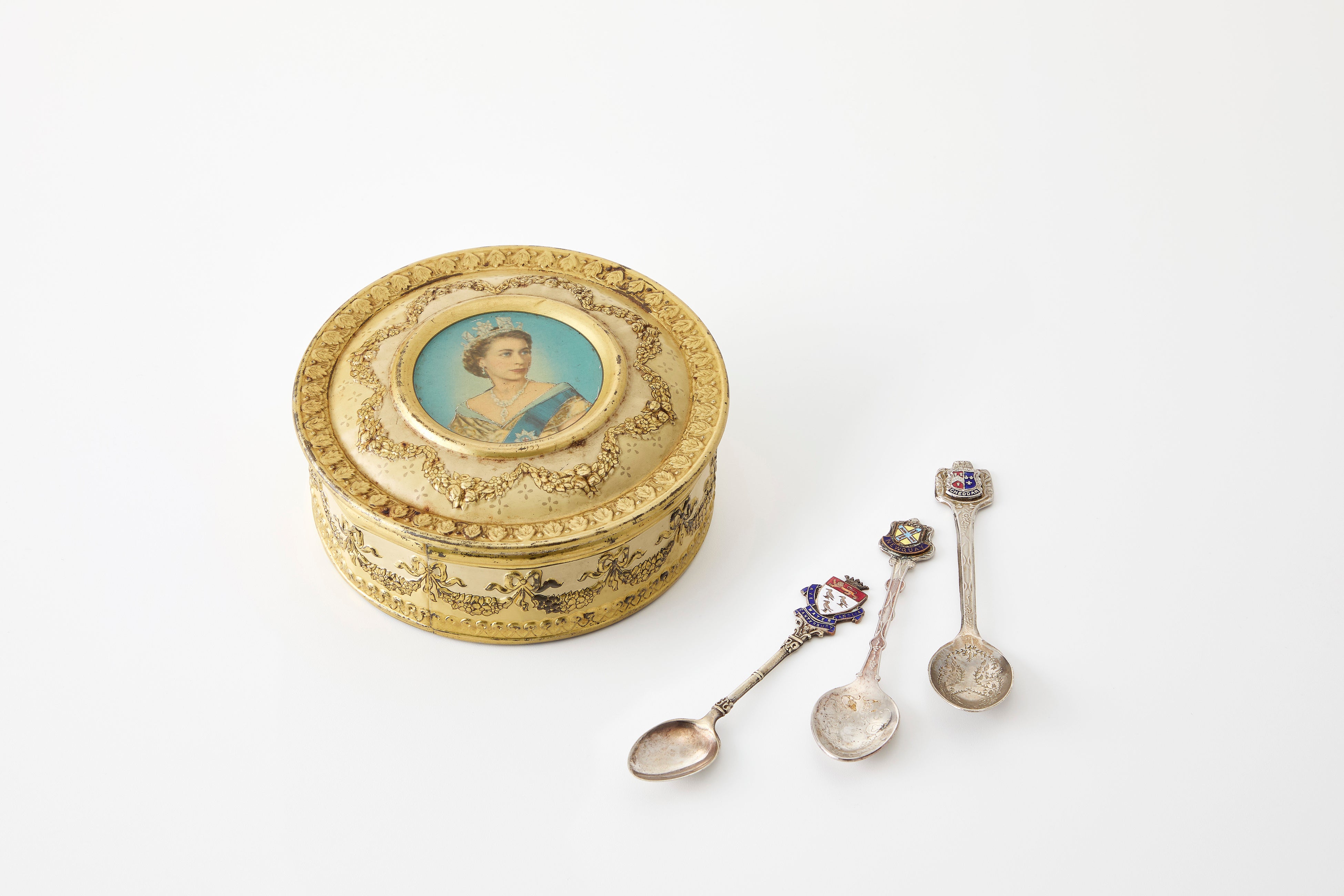 女王戴冠式記念で作られたお菓子缶&英国各地の紋章入りスプーン