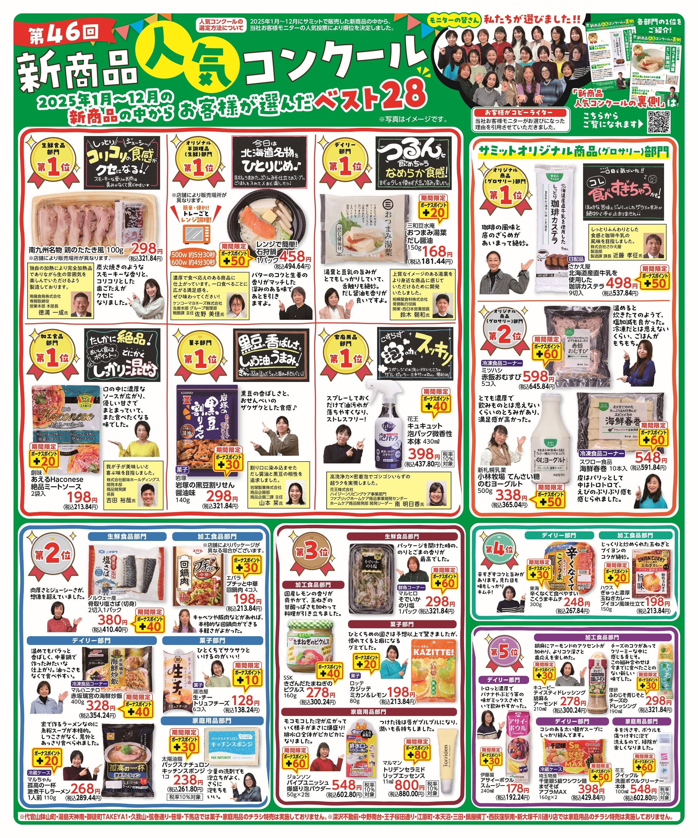 第46回『新商品人気コンクール』入賞商品が決定しました。入賞商品はサミットで昨年1年間に販売した新商品の中から、サミットお客様モニター約90名による人気投票で順位を決定したものです。入賞商品は2月18日からチラシによる紹介セールを実施します。