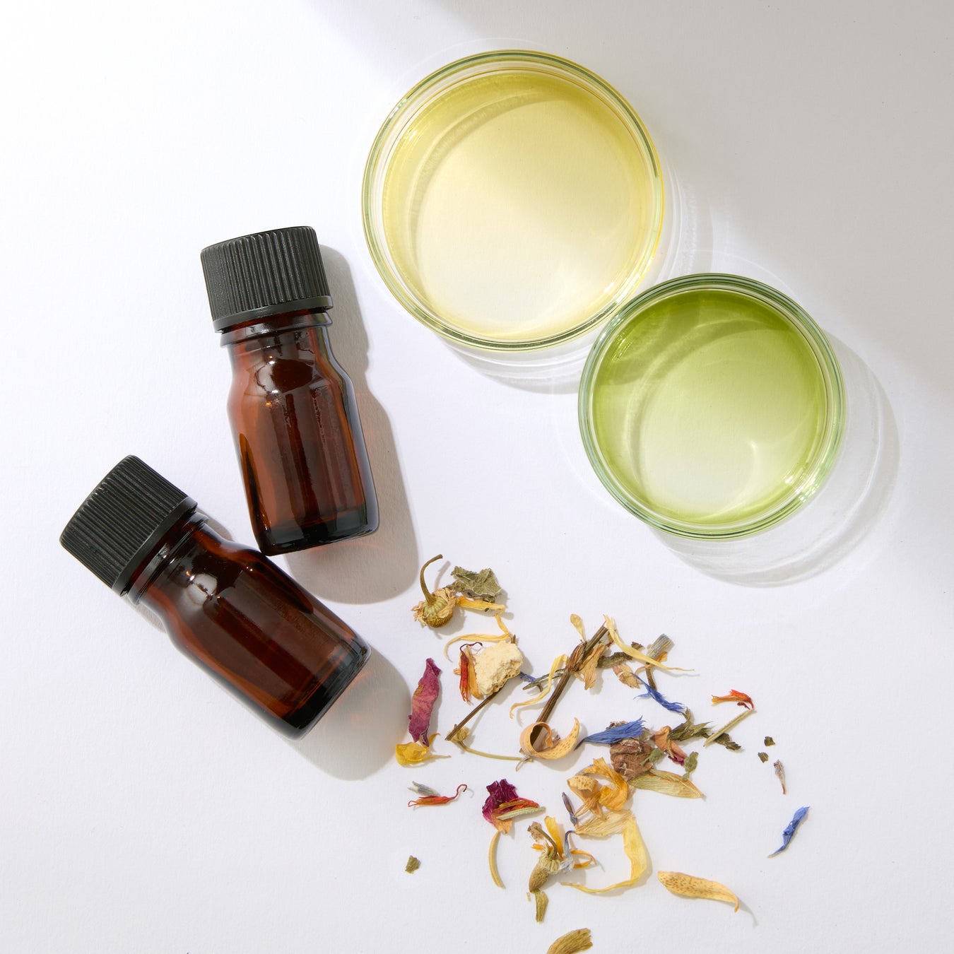 菅原あゆみ氏が精油をブレンドし、ホルモンバランスの変化からの頭皮環境をサポートする精油とストレスなどからおこる肌トラブルをサポートする精油の2つのタイプが完成。お客さまに合わせてセレクトさせていただきます。