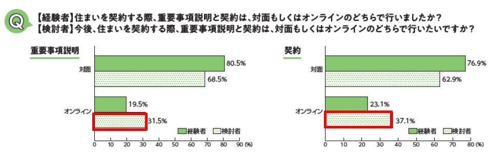 オンラインでの重要事項説明・契約の利用経験・意向を聞いてみると、オンラインで重要事項説明を受けたい検討者は約3割、契約は4割に迫りました。実際にオンラインで重要事項説明・契約を行った経験者からは、「遠方の物件だったので便利だった」「家で話を聞けたので気が楽だった」という声が多数あがりました。