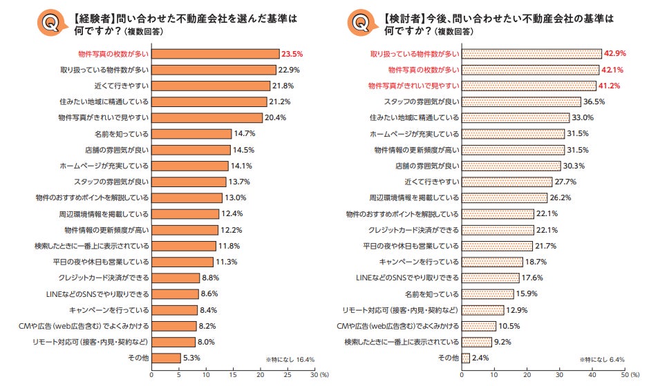 不動産会社の選定基準を聞くと、経験者は「物件写真の枚数が多い」、検討者は「取り扱っている物件数が多い」がトップでした。検討者は「物件写真の枚数が多い」「物件写真がきれいで見やすい」も4割を超えており、物件写真を重視しているようです。