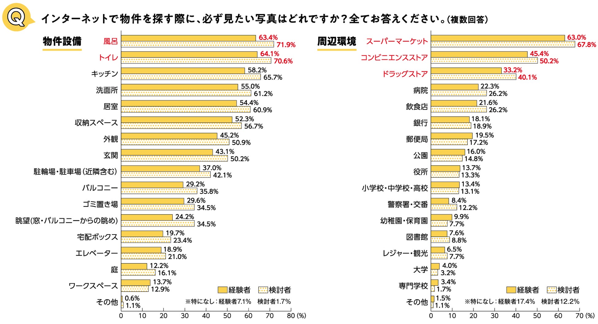 インターネットで物件を探す際に、必ず見たい物件設備の写真は経験者では「トイレ」、検討者では「風呂」が最多でした。一方、周辺環境の写真は、経験者・検討者ともに「スーパーマーケット」がトップで、次いで「コンビニエンスストア」「ドラッグストア」が続きました。