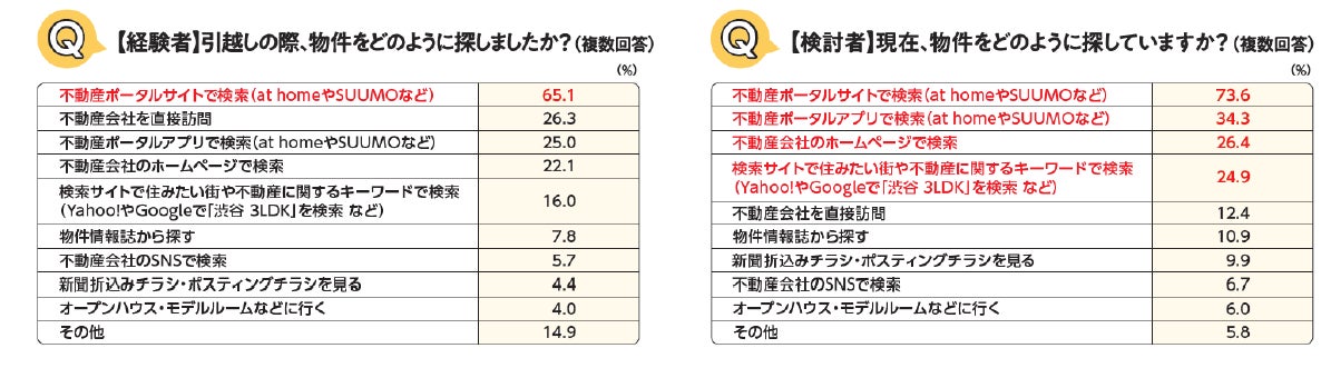 経験者・検討者ともに「不動産ポータルサイトで検索」がトップ