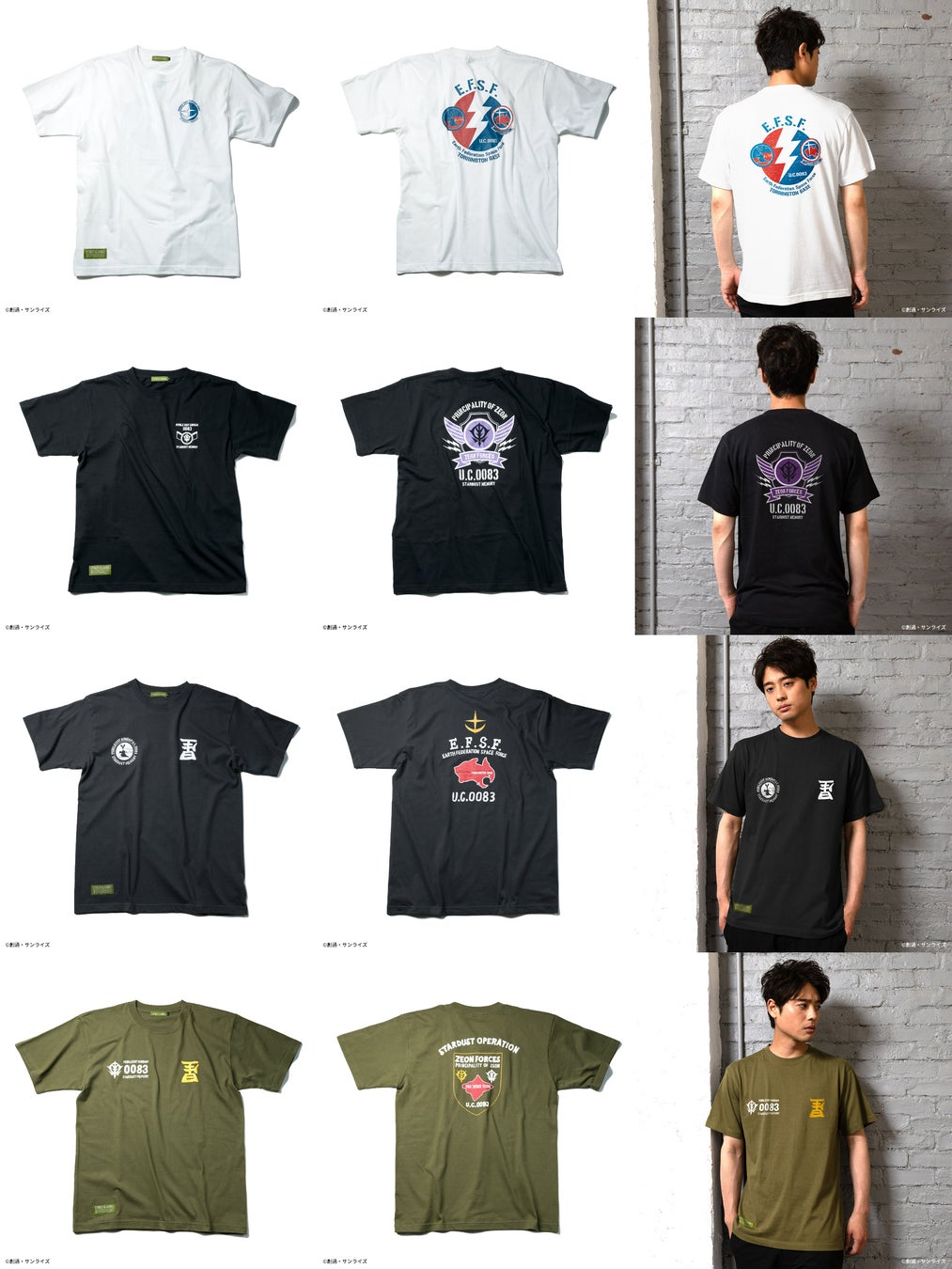 『機動戦士ガンダム 0083STARDUST MEMORY』より作中に登場する連邦軍、ZEON軍をイメージしたプリントTシャツです。ホワイトのBODYに左胸とバックに連邦軍トリントン基地のモチーフを使用したデザインのカスレ調のプリントが施されたトリントンベース柄、ブラックのBODYにアナベル・ガトーをイメージした配色のジオン公国をモチーフとしたデザインのカスレ調のプリントが施されたアナベル・ガトー柄、トリントンベースの地図を刺繍にみえるようなデザインでプリントを施した刺繍風E.F.S.F.柄、宇宙要塞ソロモンをモチーフとしたデザインを刺繍の様に見えるようにデザインで表現した刺繍風ZEON FORCES柄の4種の展開です。