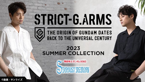 “STRICT-G.ARMS(ストリクトジーアームズ)“の23SUMMERコレクションでは、『機動戦士ガンダム 0083STARDUST MEMORY』より作中に登場する連邦軍、ZEON軍をイメージしたワッペンを両袖に配置したミリタリーシャツ2型、プリーツと刺繍が特徴のキューバシャツ2型、カスレ調のプリントを施した半袖Tシャツ2型、刺繍をイメージしたデザインのプリントを施した半袖Tシャツ2型の計8アイテムを展開致します。
