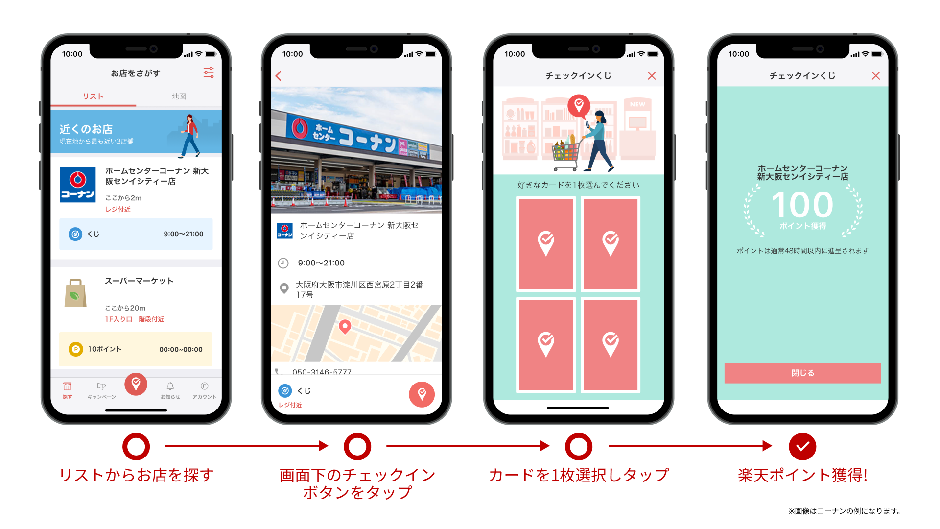 これにより、利用者は店内の指定エリアで「楽天チェック」アプリを起動しチェックインすると、くじ形式で「楽天ポイント」を最大100ポイント獲得することができるようになります。