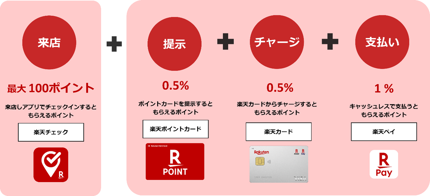 ・「楽天チェック」による、来店時における「楽天ポイント」の獲得:1回のチェックインにつき、