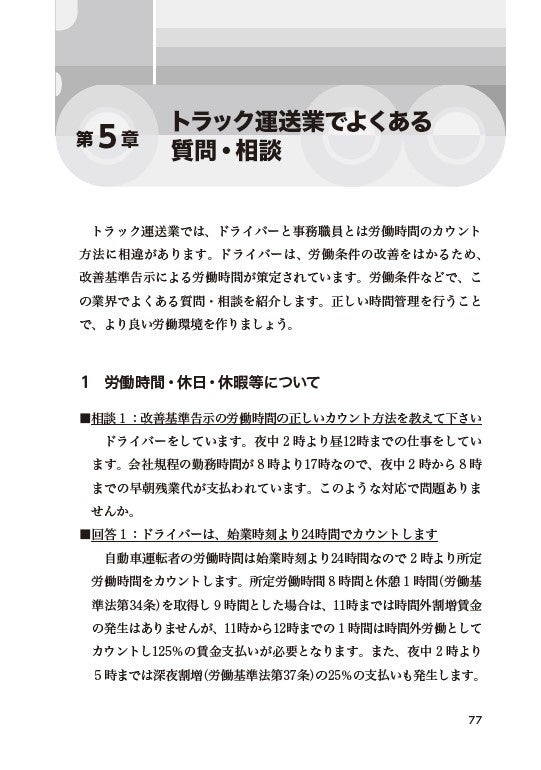 当社では上記の課題をもつ中堅・中小のトラック運送事業主と人事労務担当者に対し、25年のトラック運送業務経験をもつ社労士による具体的な時間外労働の削減方法や実務の詳細についてのわかりやすい解説で、対応すべきポイントと、荷主の理解・協力を得るための具体的な手法と進め方がわかる『―売上・利益を維持し、ドライバーを定着させる―中小企業のためのトラック運送業の時間外労働削減の実務』を発売しました。