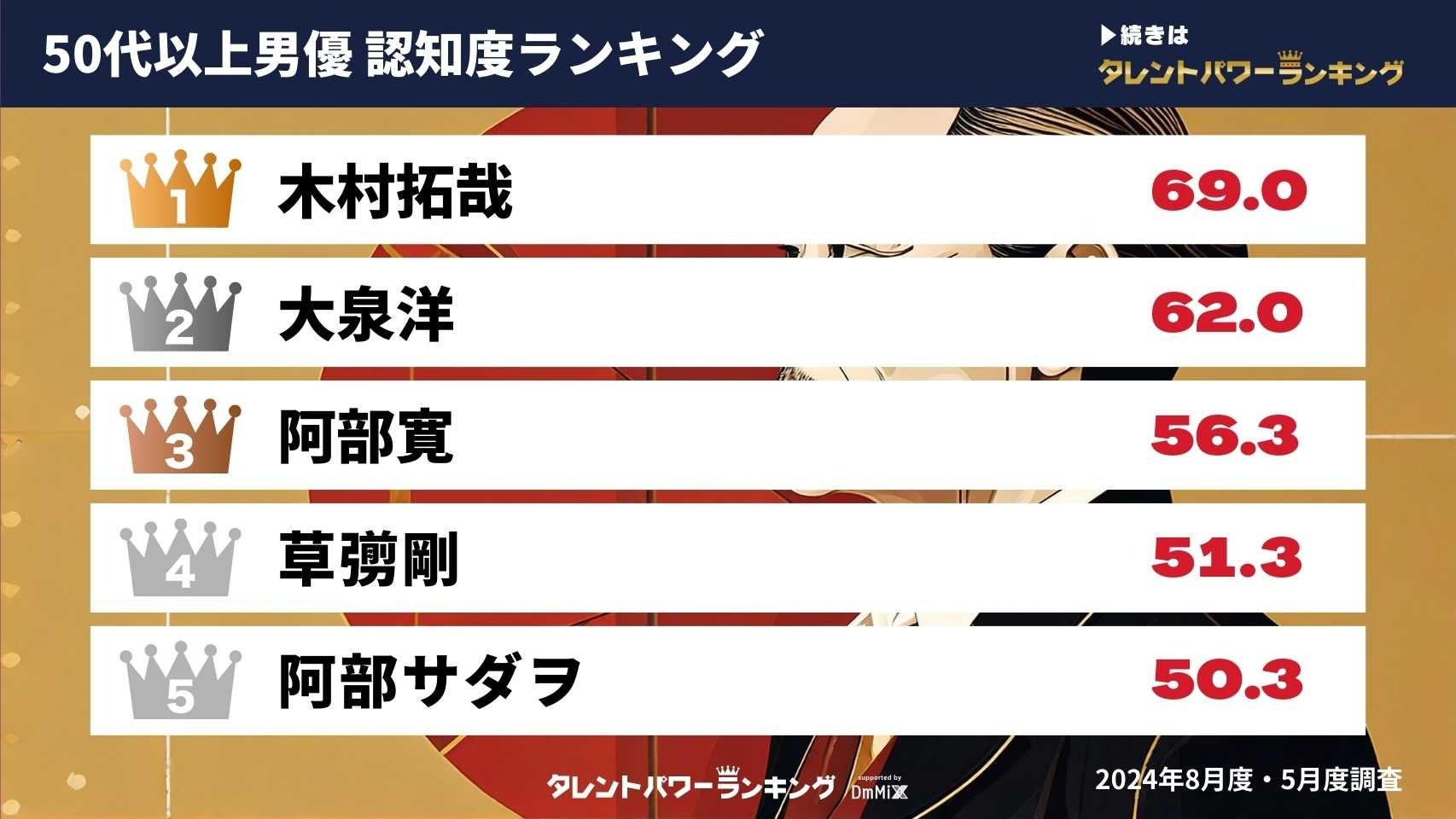 『タレントパワーランキング』がZ世代にもよく知られている50代以上の男優認知度ランキングを発表!WEBサイト『タレントパワーランキング』ランキング企画第367弾!