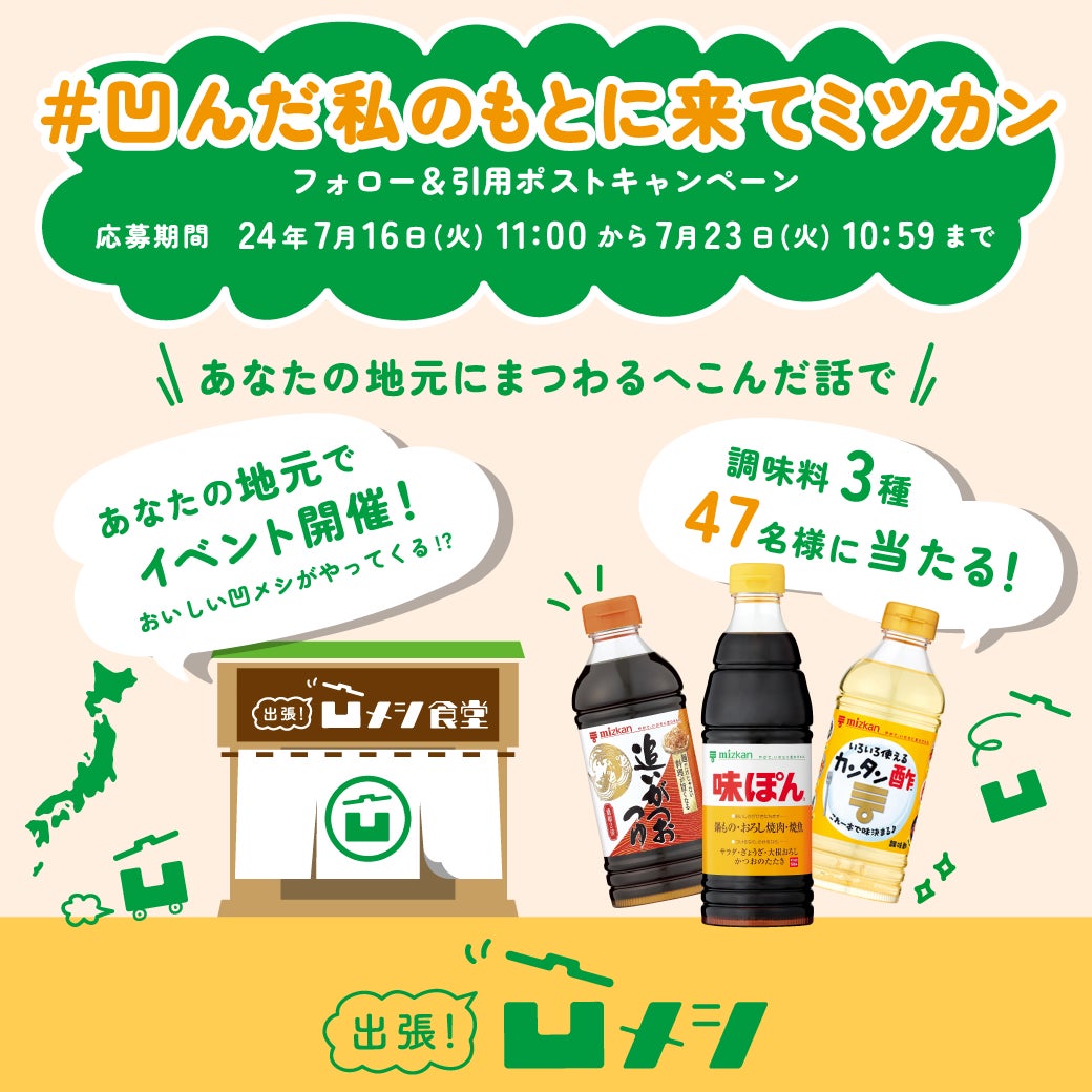 皆様の声を聞く中で、まだまだたくさんのへこんでいる人が日本中にいると考え、「出張凹メシ」を実施することを決定いたしました。7月16日(火)から7月23日(火)までX上で「#凹んだ私のもとに来てミツカン」キャンペーンを行い、全国からその都道府県ならではのへこんだエピソードを募集します。キャンペーンでの投稿をもとに実際にミツカンが出張する場所を決定し、へこんだ気持ちが元気になるよう、出張先の地域でおいしいごはんを提供するイベントとなっております。