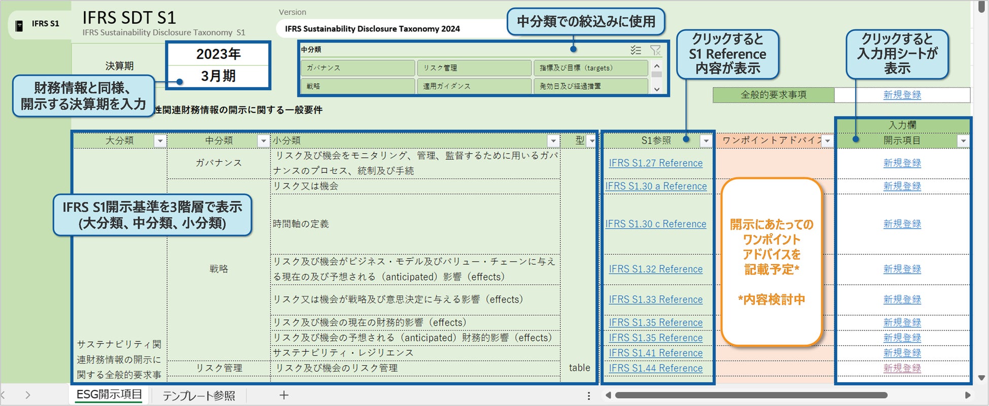 テンプレート上にIFRS財団から提供されている「リファレンス内容」やテンプレート入力時に考慮してほしい「ワンポイントアドバイス*4」などの補足情報を開示項目ごとに掲載することで、IFRS S1・S2基準に沿った上場企業側での適切なデータ入力を支援します。