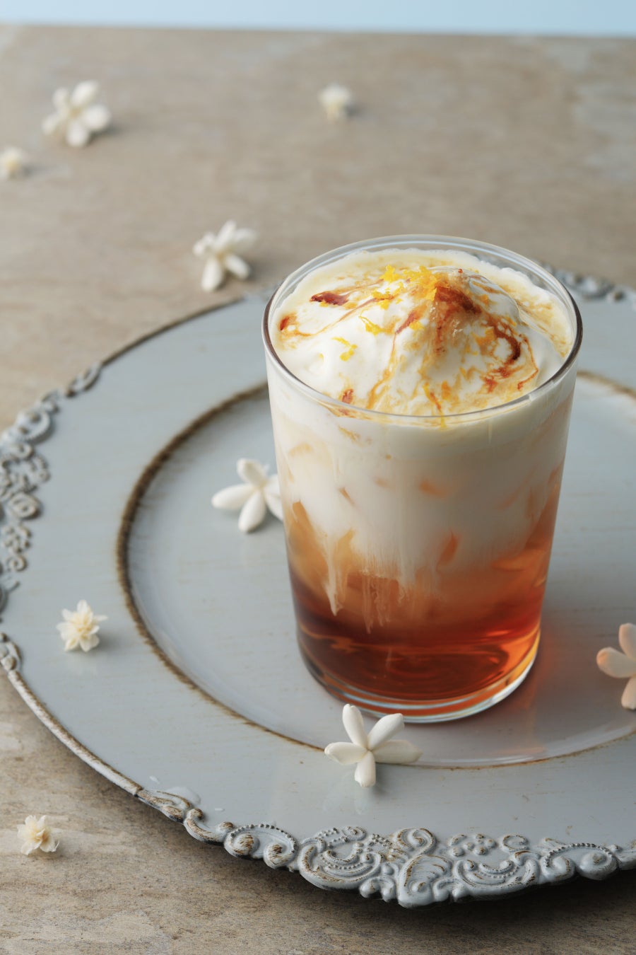 甘く優雅な香りの「ライチ&ジャスミン」の紅茶と自家製ティーシロップに、コクのあるミルクを加えた香り豊かなミルクティーです。なめらかに仕上げたホイップクリームときび砂糖®のブリュレをトッピングし、仕上げにオレンジの皮を削って、見た目も華やかに彩りました。クリーミーでありながらもすっきりとしたフラワリーな香りと味わいが、やみつきになるおいしさです。ぜひ、じっくりとお楽しみください。
