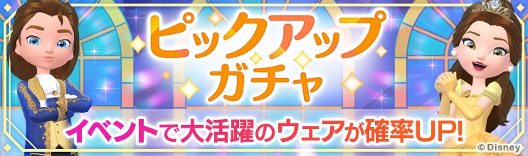 「美女と野獣 すてきな宝物」ピックアップガチャでは、「ベルのプリンセスドレス」「ビーストのロイヤルコート」が期間限定で登場し、提供割合がアップします。