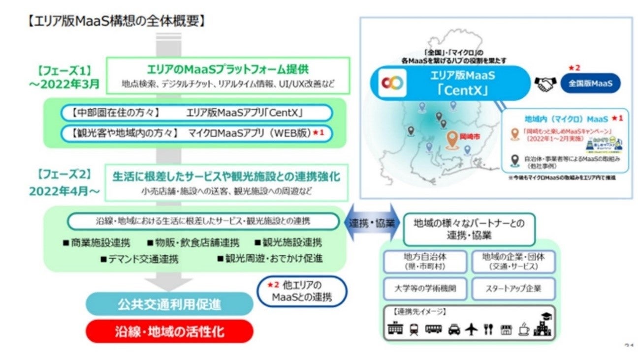 名古屋鉄道は、名鉄グループ沿線・地域(愛知県・岐阜県中心)の交通・生活・観光サービスをつなぎ、シームレスでストレスフリーな移動の実現を目指すエリア版MaaS構想を推進しています。今回の取り組みは、「全国版MaaS事業者との連携」を推進し、交流人口の増加による沿線・地域の活性化を目的として推進するものです。