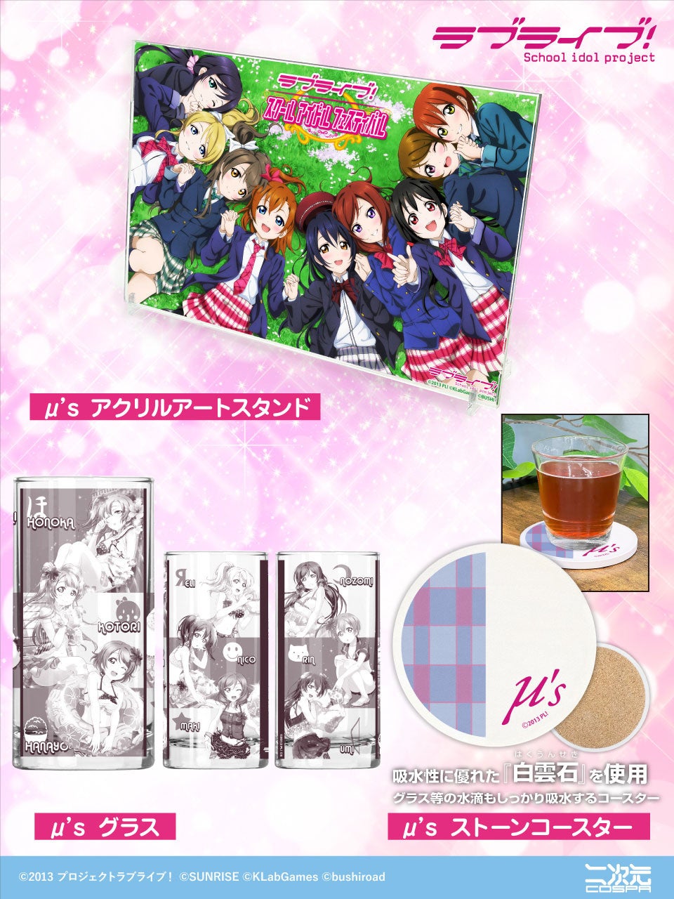 「Printemps」「BiBi」「lily white」それぞれを代表する印象的な衣装のメンバーたちの「アクリルスタンド」をはじめ、μ’sの「グラス」「ストーンコースター」「アクリルアートスタンド」が二次元コスパからラインナップいたします。