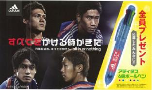 アディダス キッズ商品を購入し、キャンペーンに応募すると全員にアディダス6色ボールペンをプレゼント! さらに、香川真司、内田篤人、清武弘嗣、酒井高徳、田中陽子、村上佳菜子、太田雄貴、 内海哲也、坂本勇人の、あこがれの選手の直筆のサイングッズが45名様に当たる!