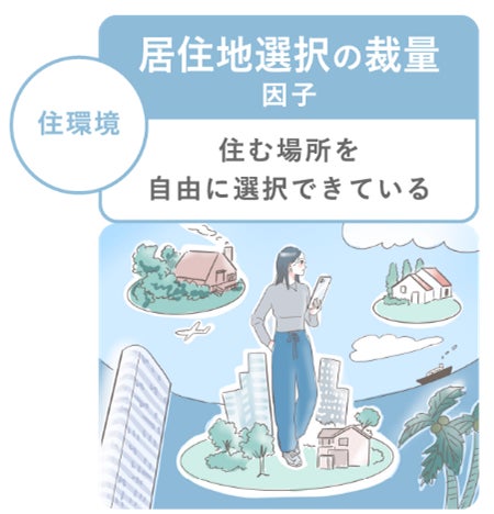 他因子や非単身世帯と比較して単身世帯の満足度が高い因子として、「居住地選択の裁量因子」が挙げられます。住む場所というテーマにおいて、自由に選択できているという点は単身世帯ならではの特徴であり、幸福度にも好影響を及ぼしています。