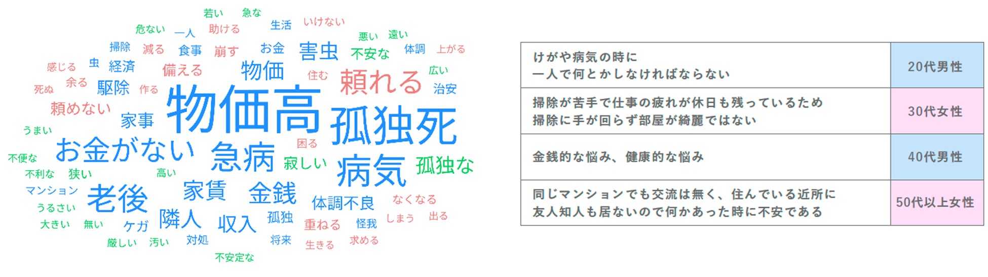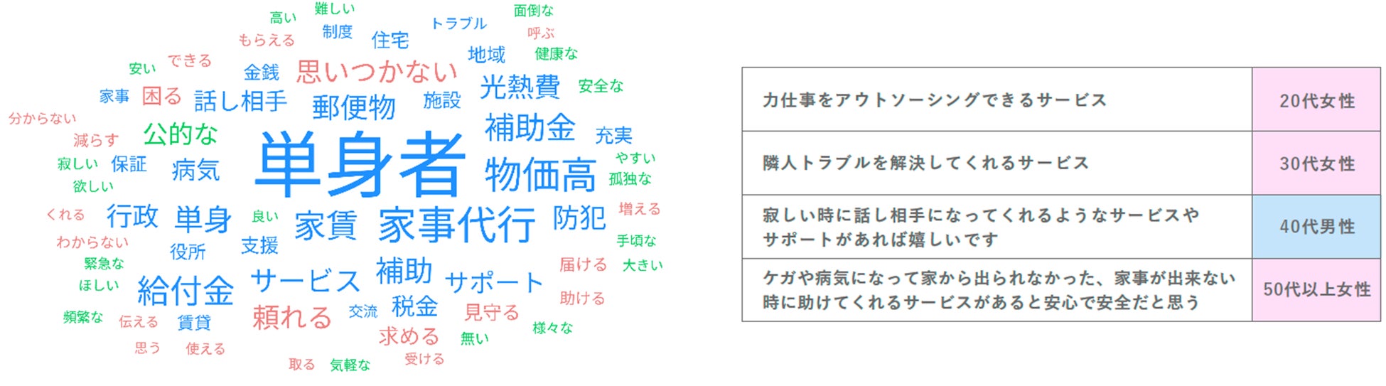 抽出条件は設けず、単身世帯全体の800名の回答を見たところ、「郵便物」「防犯」「家事代行」「話し相手」「病気」などのワードが頻出しています。具体的には、以下のような回答が見られました。