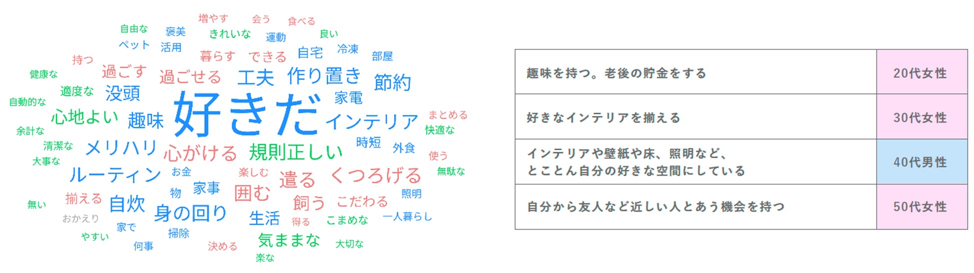 現在の幸福度について6点~10点と回答した408名に絞って回答を見ると、「好きだ」「規則正しい」「メリハリ」「趣味」「インテリア」「ルーティン」などのワードが頻出しています。具体的には、以下のような回答が見られました。