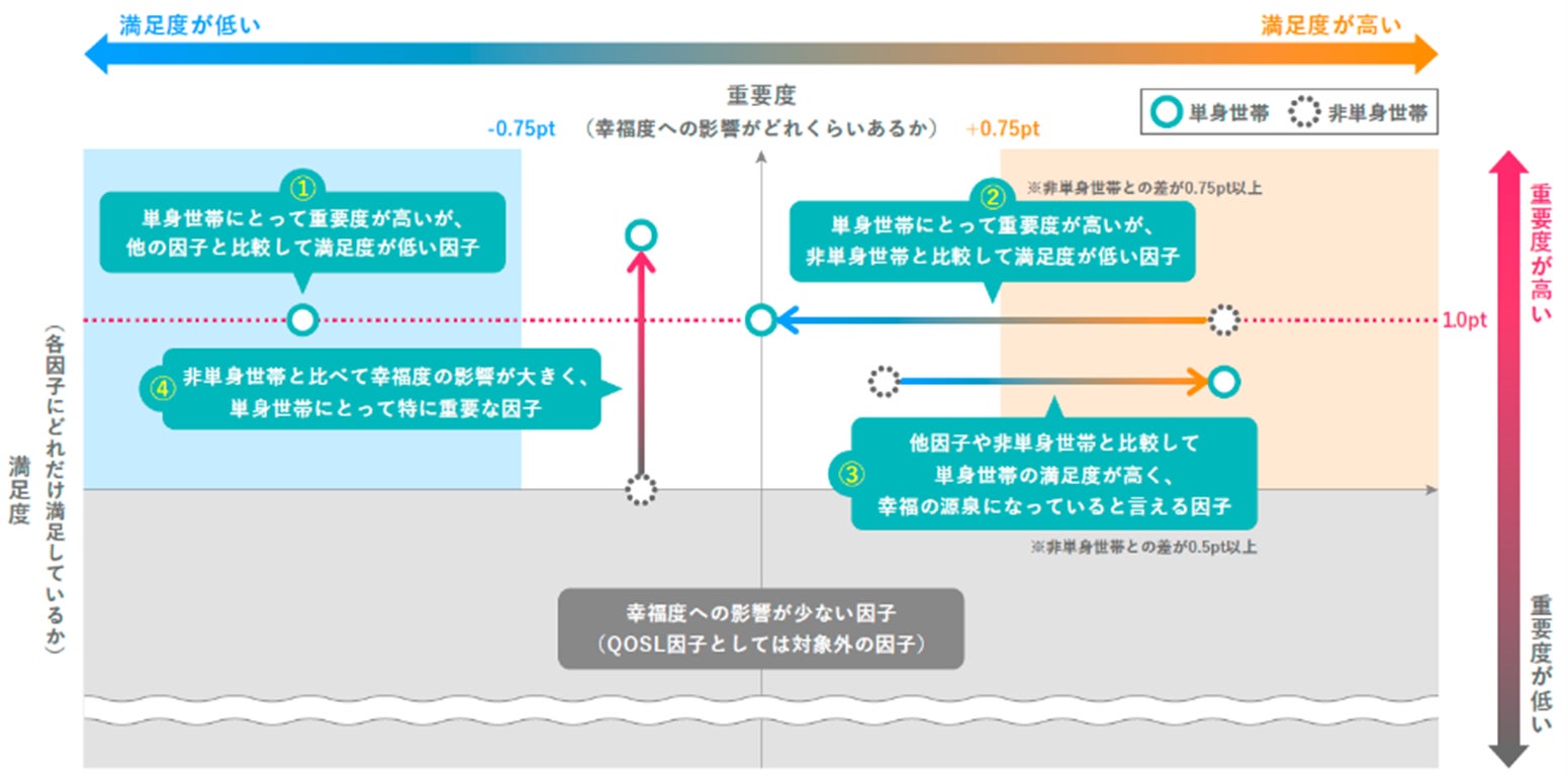 ① 【他因子より不足】 単身世帯にとって重要度*2が高いが、他因子と比較して満足度*3が低い因子
