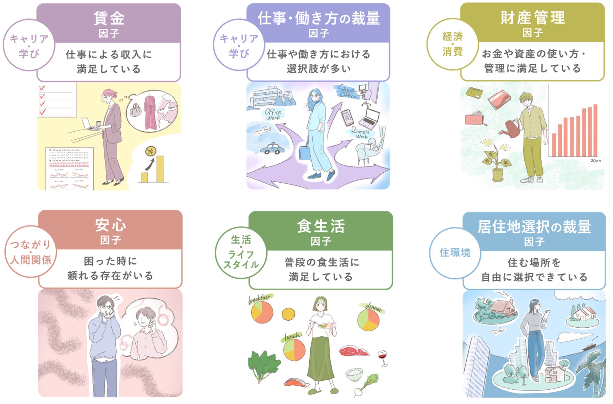 今回の調査では、6カテゴリ36項目の候補の中から「単身世帯の幸福度に影響を与える因子」を、後述の分析方法を用いて抽出いたしました。その結果、以下6つの因子が、単身世帯の幸福度に影響を与えている可能性が高い、「QOSL因子」であることが明らかになりました。なお、QOSLは「Quality of Single Life」の略で、単身世帯の人生や生活の質を表すキーワードとして+ONE LIFE LABが定義・作成しました。