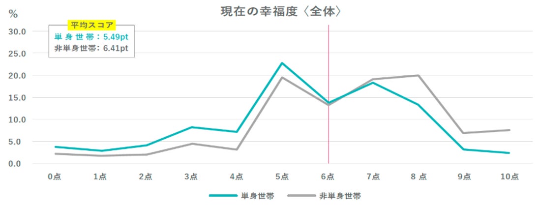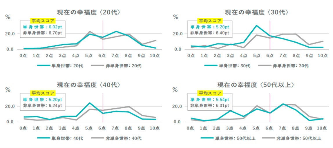 現在の幸福度を0~10ポイントの11段階で聞いたところ、単身世帯は平均5.49ポイント、非単身世帯は平均6.41ポイントとなり、平均スコアで見ると、単身世帯が非単身世帯を約1ポイント下回る結果となりました。年代別に見ると、どの年代においても単身世帯は非単身世帯を下回っているものの、20代は単身世帯が平均6.02ポイント、非単身世帯が平均6.70ポイントで、最もスコア差が小さい結果になりました(スコア差0.68ポイント)。また、どの年代においても、6ポイントを基準に両側に山(=キャズム)が存在しており、幸福度が低い層と高い層が分かれる傾向にありますが、特に30代・40代は低い側のゾーン(5ポイント未満)が拡大しています。